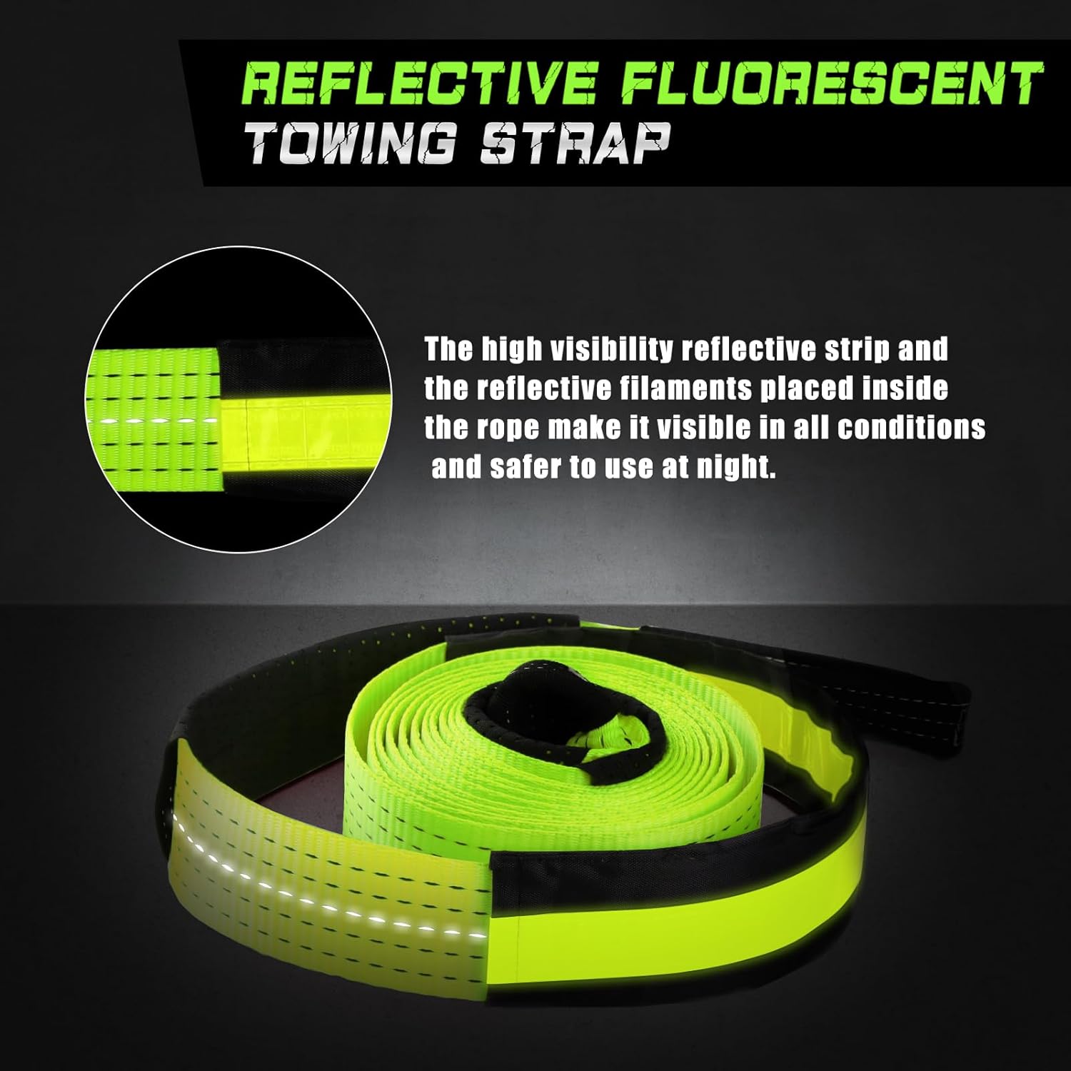 - 🚗【High visibility Reflective Strip】:This tow rope with a reflective band at the center of the rope, and there are reflective strip inside the strap. In addition, the recovery tow strap is in bright green, a high visibility color that allows for safer use by making rope easier seen by drivers or others under any conditions.