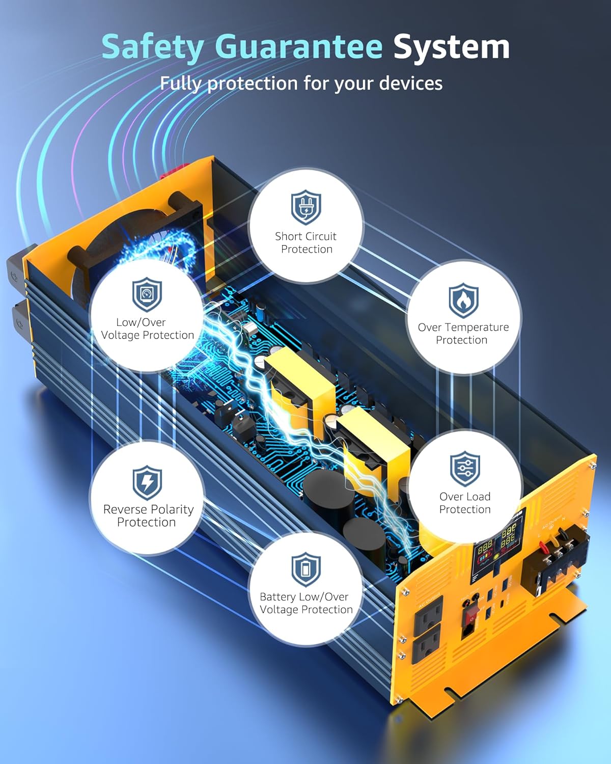 - 【INTELLIGENT LCD DISPLAY SCREEN】This inverters features a bright LCD display that can show your voltage, protection status,frequency and so on. Allows you to easily identify the current operation status and alert messages.