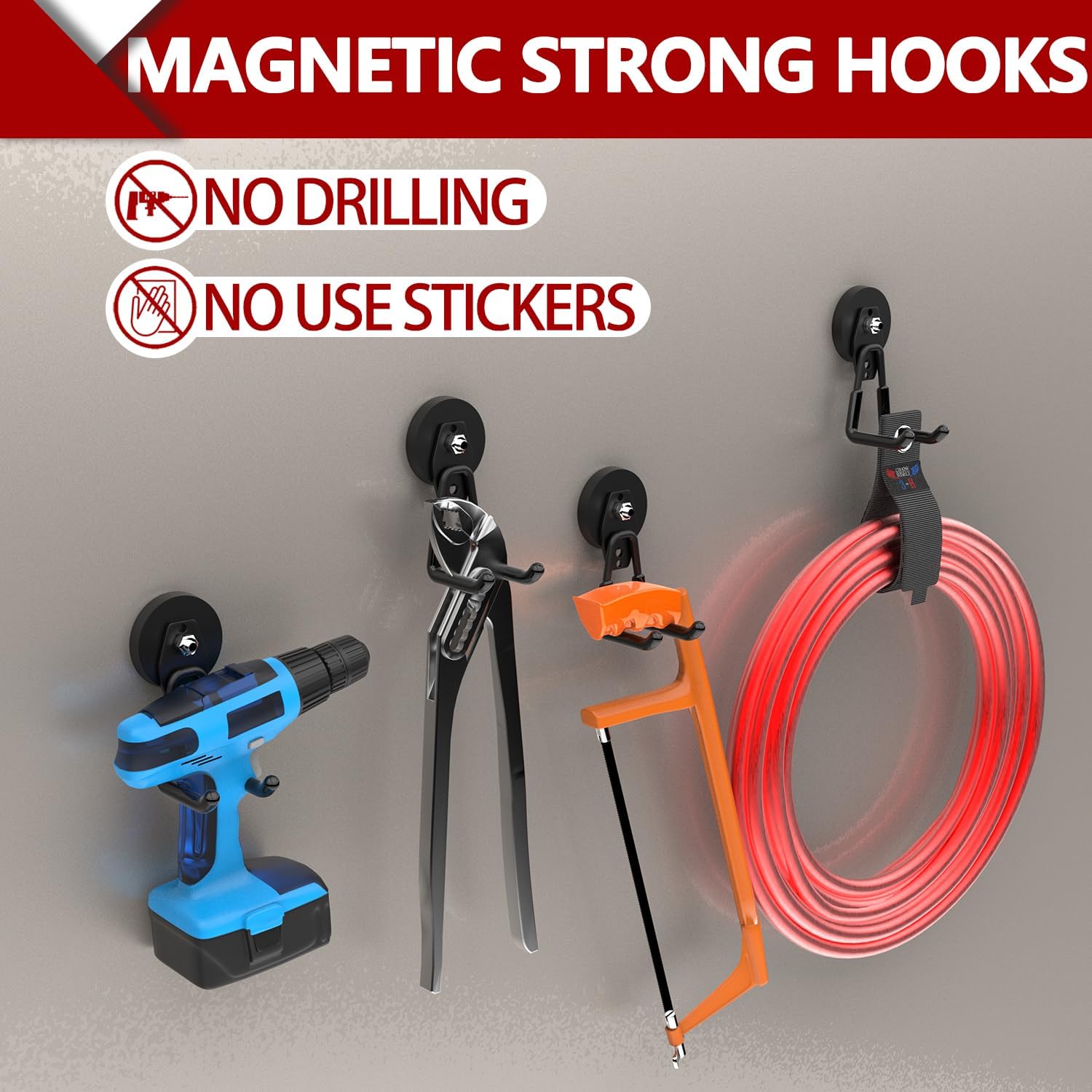 - Easy To Install Strong Heavy Duty Hooks: 2 usage options available: (1) heavy duty magnetic hooks for garage can be adsorbed on any metal surface. No tools, drilling, or screws are required for installation, ensuring no damage to the surface. (2) Alternatively, you can remove the magnet and use the garage storage hooks independently. For storing heavier tools, we provide sturdy screws that can be used to securely install the heavy duty hooks for garage on any wall surface