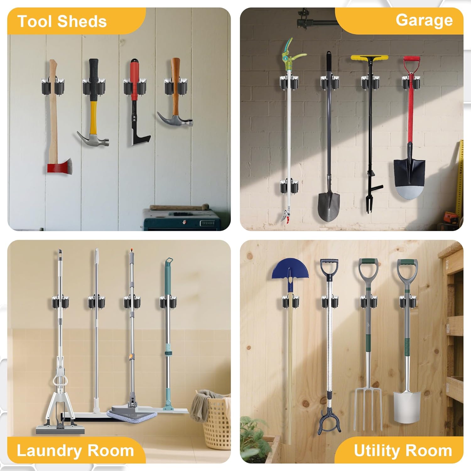 - 【Suitable for More Settings】 This mop and broom holder wall mount is ideal for neatly storing broom, mop, dustpan, shovels, rakes, and more. Perfect for use in garages, laundry rooms, tool sheds, and storage areas—it’s a must have for tidy, functional spaces.