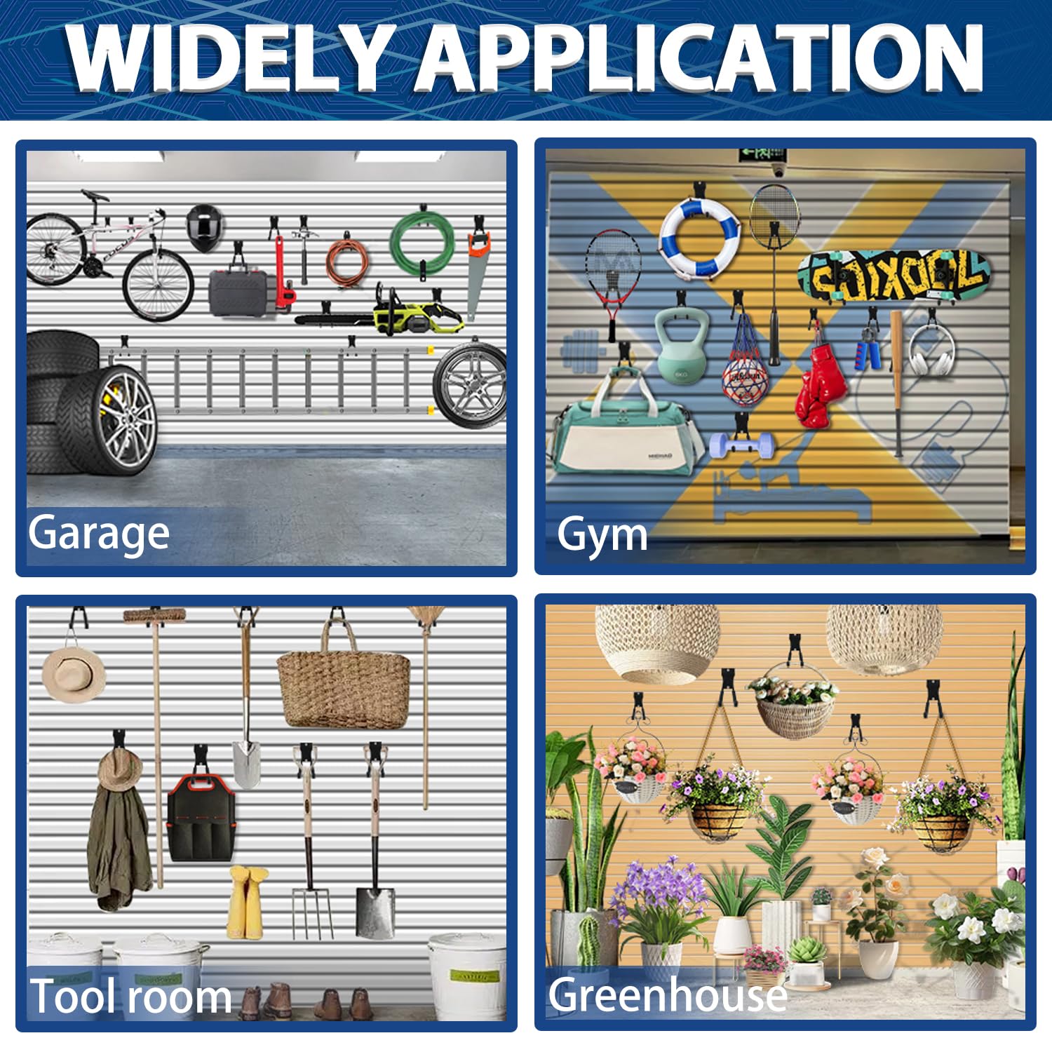 - Easy to Install and Space Saving: slat wall hooks fit standard slat wall like Proslat, Handiwall, Crownwall, etc., you can directly place slat wall hanging hooks to both sides of the panel groove, fix garage hooks for hanging into the groove on the panel then press slatwall brackets down and ladder hook will fit perfectly. Then you can move garage hooks to anywhere you want to put, saving you time and effort