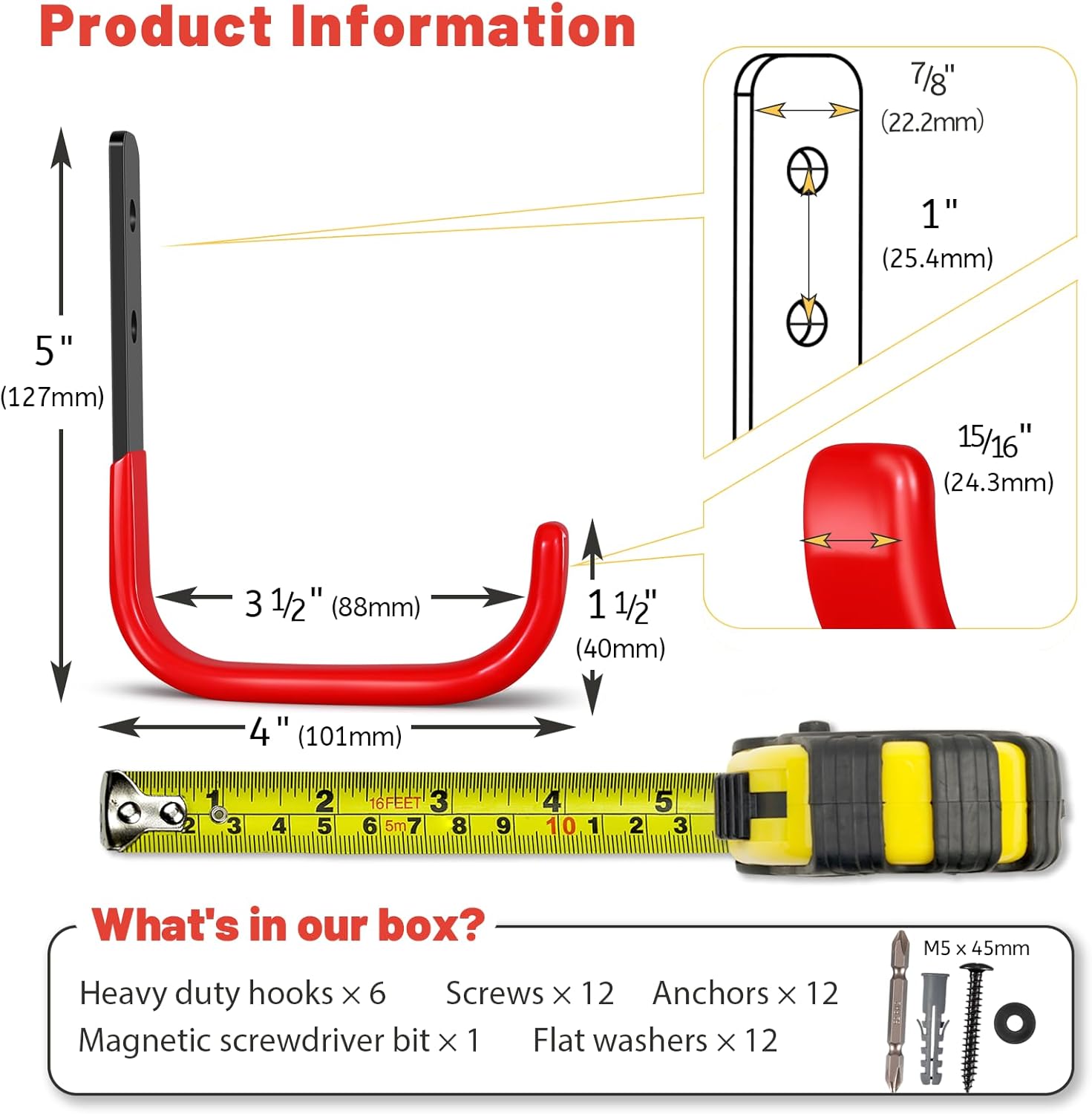 - EASY INSTALLATION: The garage wall hooks design is simple, allowing for quick and easy installation. It comes with detailed installation instructions and all the necessary mounting hardware, making it easy to install without requiring any professional skills.