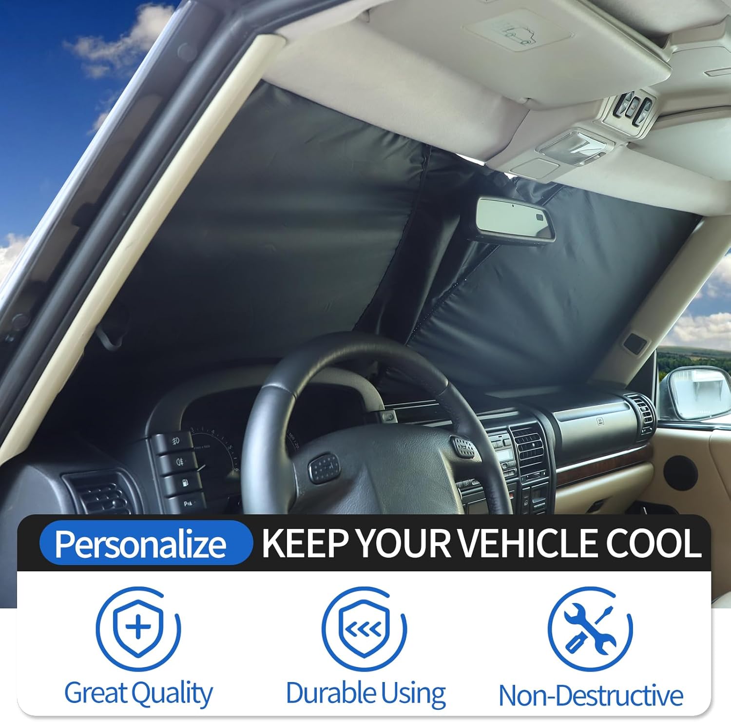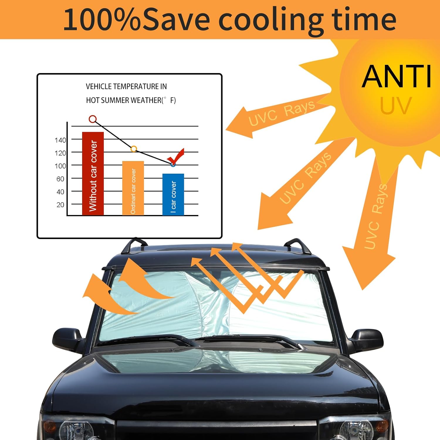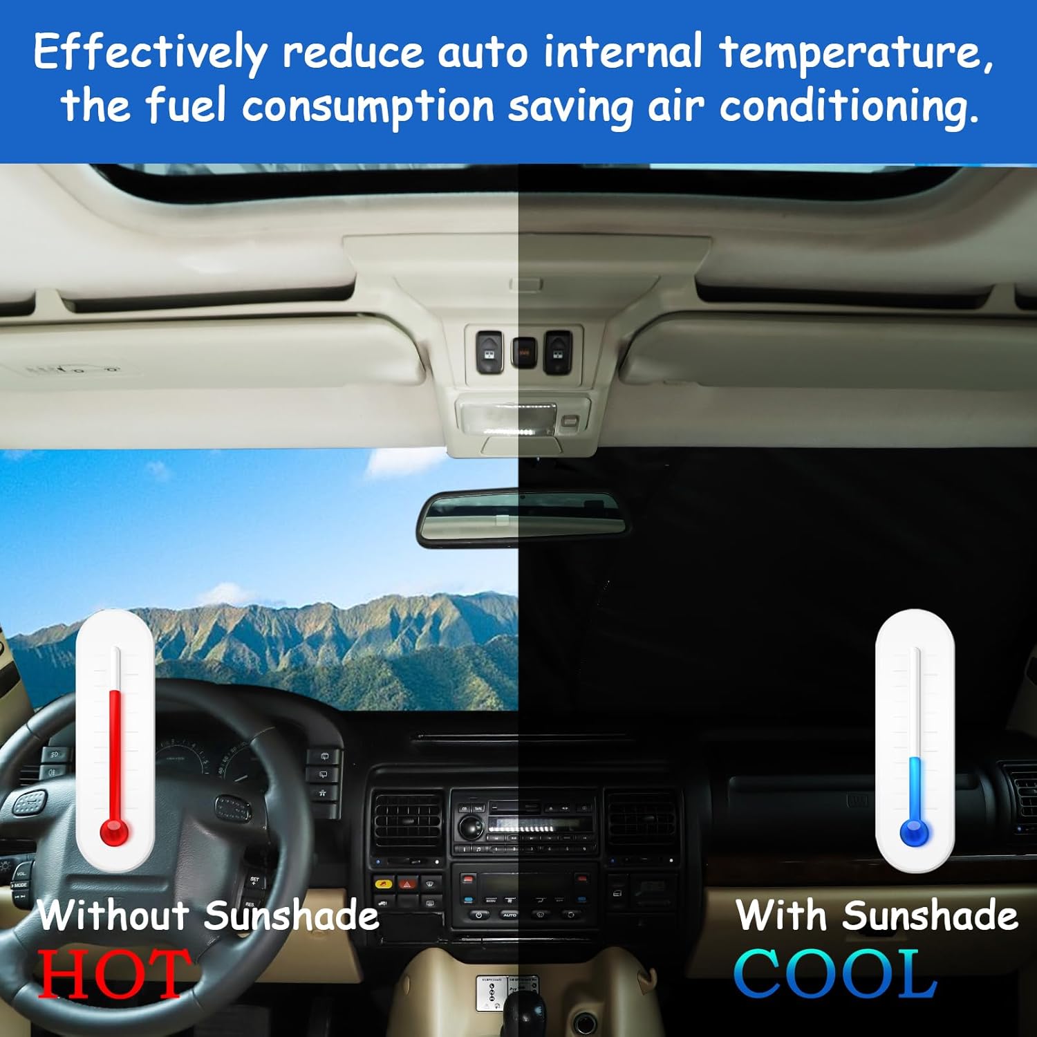 - 🌞KEEP VEHICLE COOL: Car sunshade windshield is designed especially to your vehicle interior cool and comfy. The reflective material will blocks sunlight and heat, not only effectively reduce automobile internal temperature, the fuel consumption saving air conditioning, also prevents fading and cracking the center console accessories.