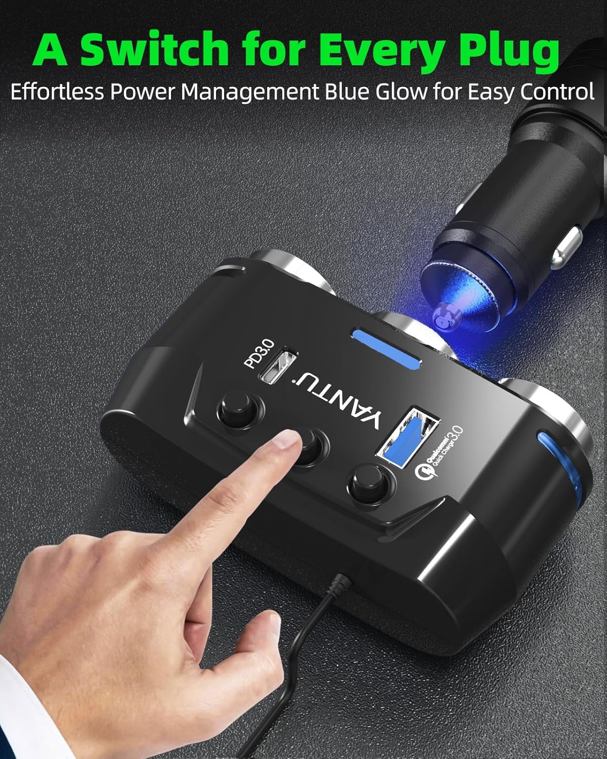 - 【Blue LED Lights & 40W Super Fast Charging Cigarette Lighter Splitter】 Illuminate your vehicle’s interior with the stylish blue LED lights of this Cigarette Lighter Adapter. Featuring a total 40W super-fast charging capability with QC3.0 and PD3.0 ports, This Car Charger Adapter utilizes Smart IC technology to detect your devices and deliver optimal charging speeds. The Cigarette Lighter Splitter not only enhances visibility but also keeps your devices powered up efficiently.