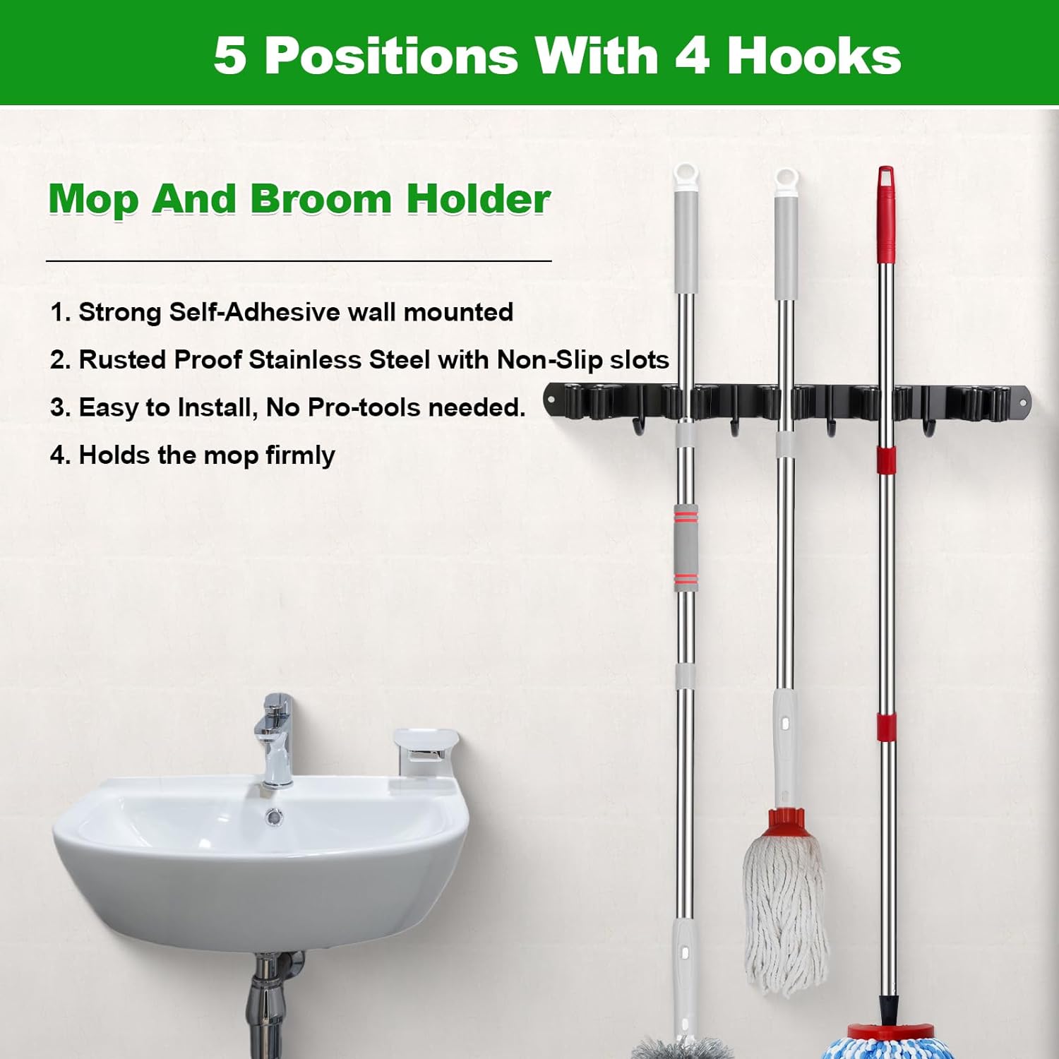 - [Sturdy & Non-slip] The broom and mop holder wall mount with 5 slots and 4 hooks is made of rustproof 304 stainless steel, which is beautiful and much more durable than plastic materials, It's non-slip high elasticity clips can holds your broom, mop, umbrella or other garage tools firmly. You can install the tool storage rack with self-adhesive or screws to mount on the wall.