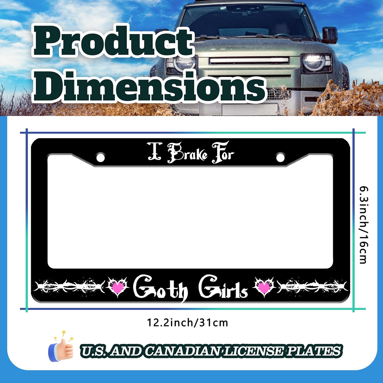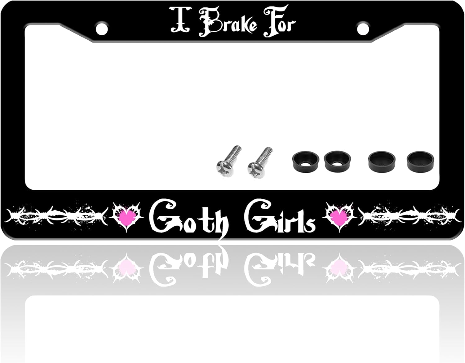 I Brake for Goth Girls License Plate Frame Funny Gothic License Plate Holder for Front or Rear Car Tags Reusable Durable Stainless Steel Car Decoration with Screws 6.3 X 12.2 Inch for Men Women