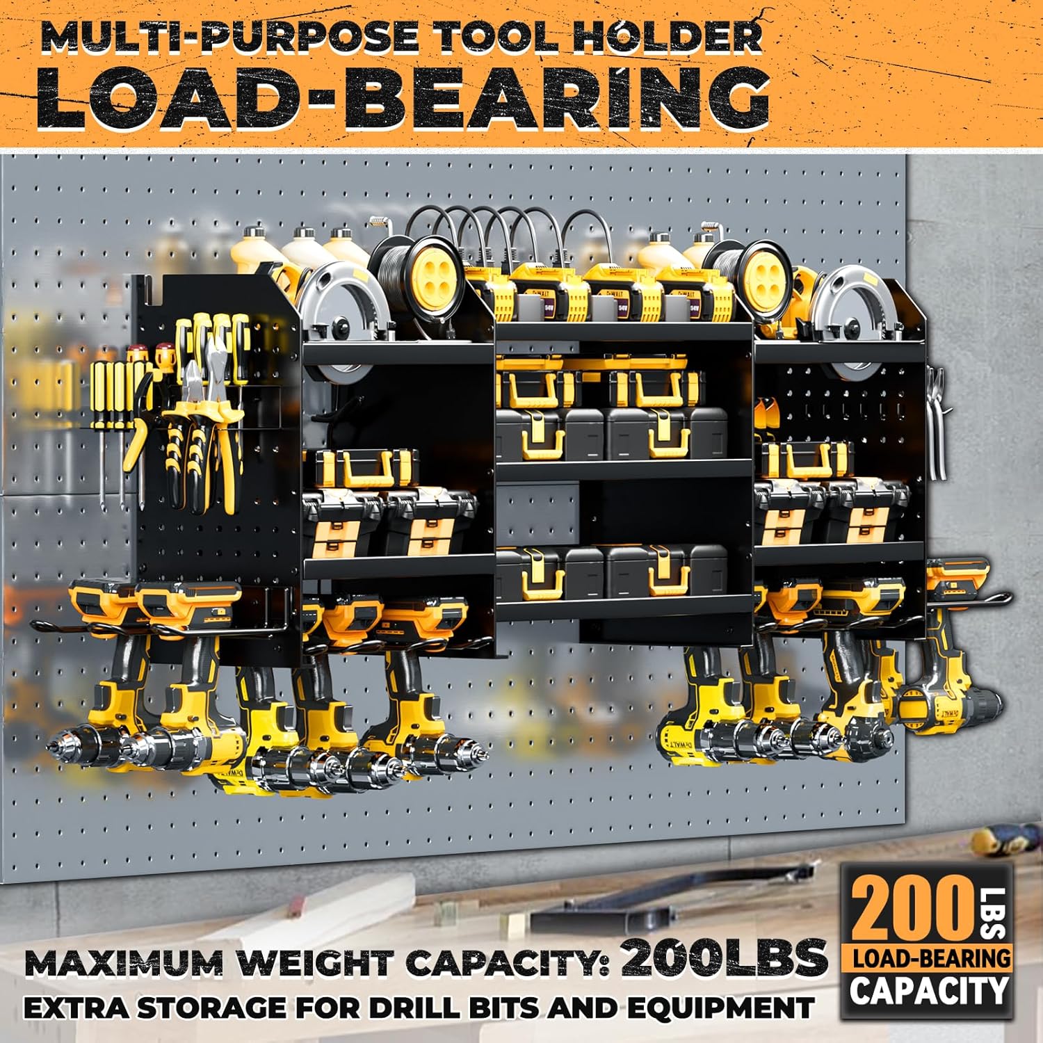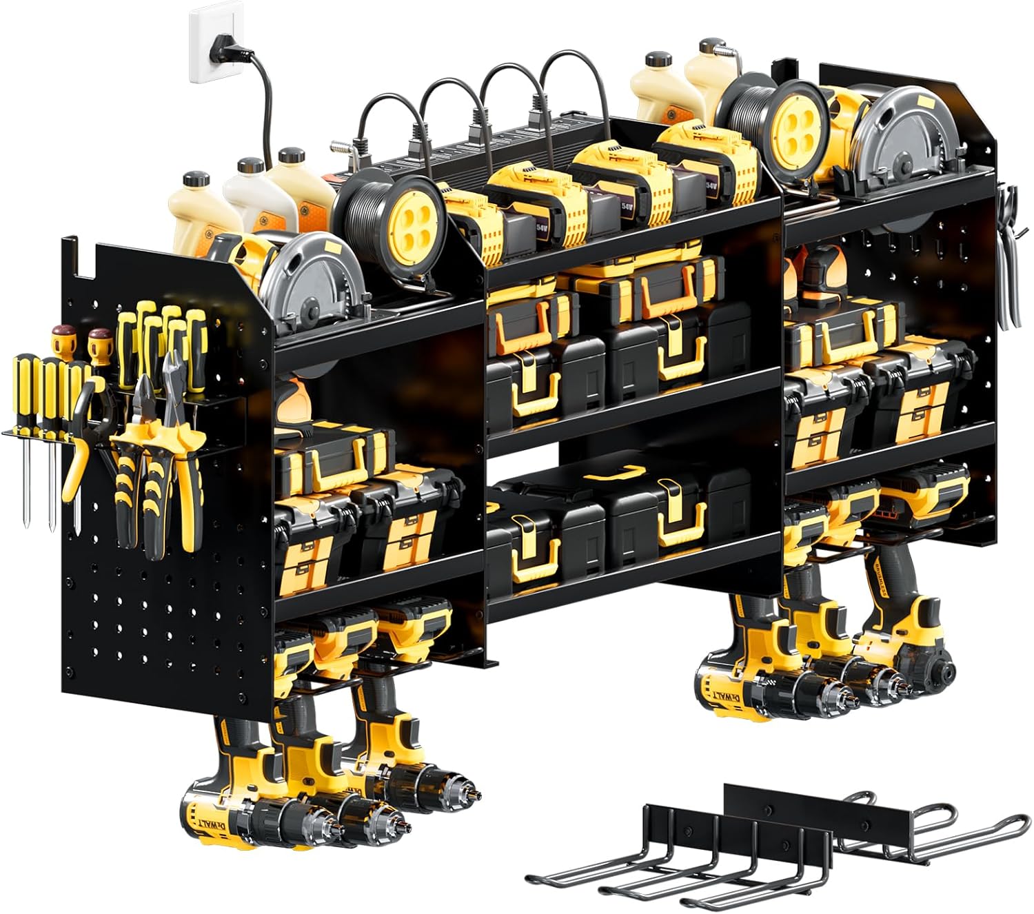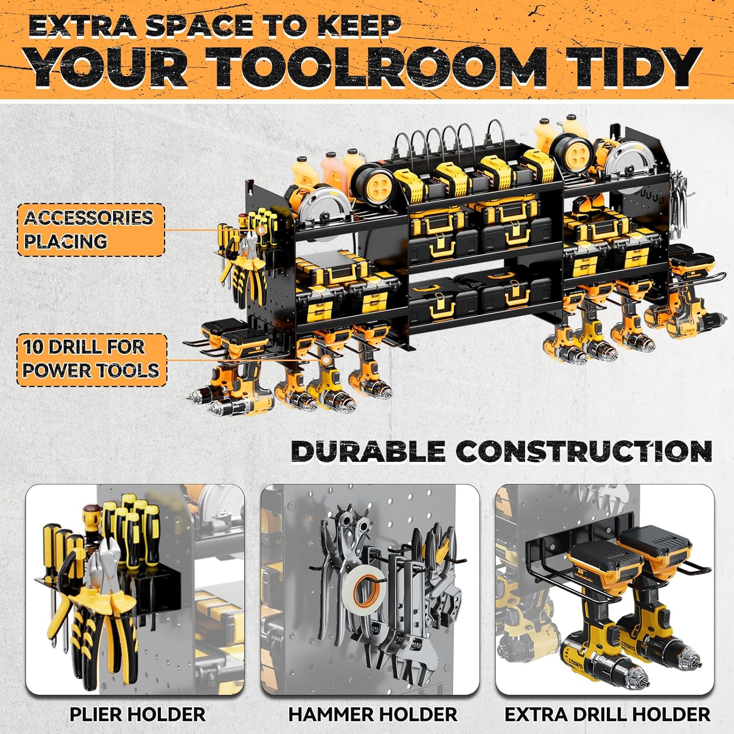 - [High-Capacity Storage]Wall mount power tools organizer features 10 drill holder, alongside a built-in power strip. Its double layer structure keeps rechargeable tools organized in the work area, saving bench space. Notably, the spacing between the middle tiers is significantly larger than typical market offerings.