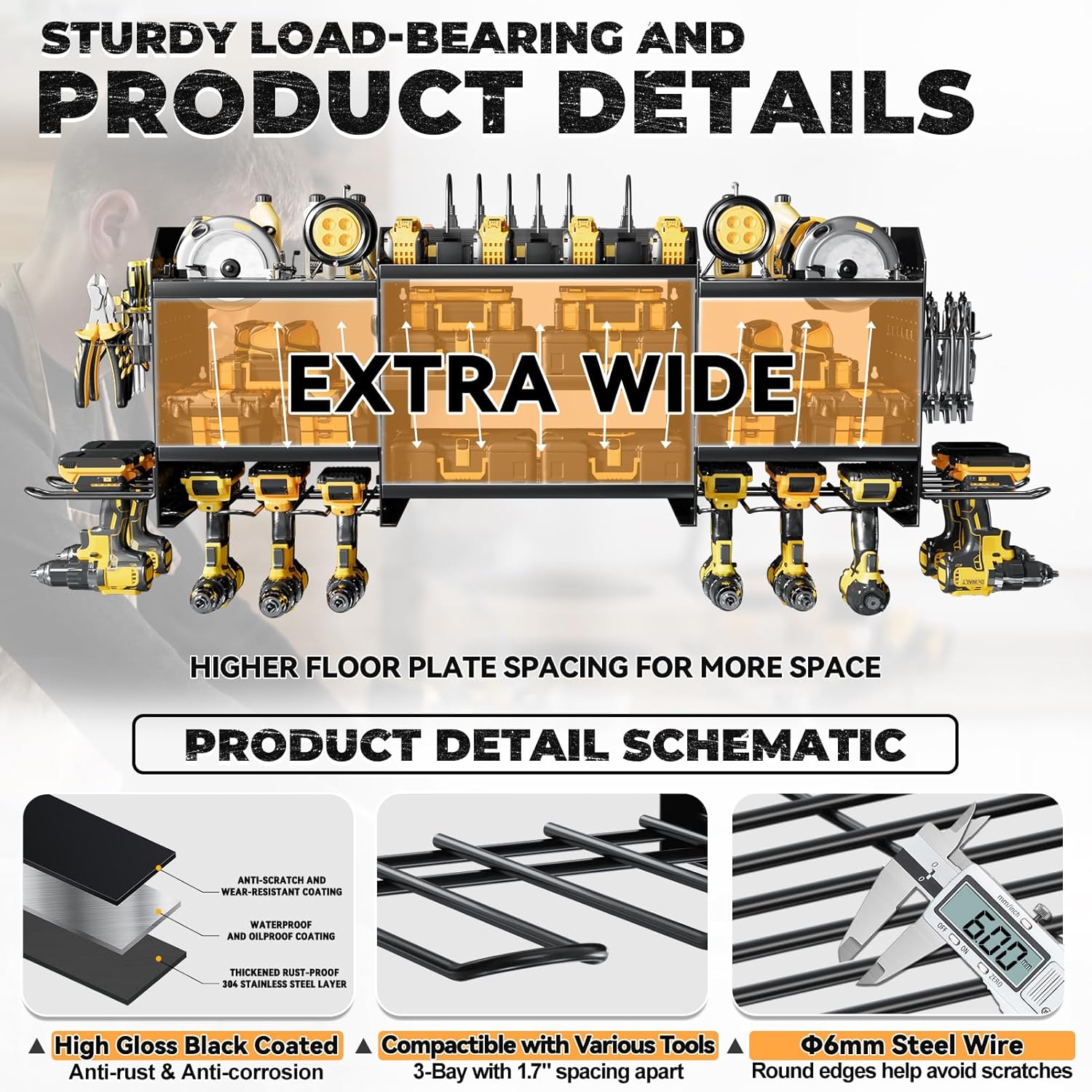 - [Perfect Garage Companion]Utilizing wall-mounted installation, this power tool rack maximizes unused wall space, saving time in tool retrieval. Ideal for garages, homes, workshops, sheds, backyard shops, and more, it offers suspended tool organization and storage.