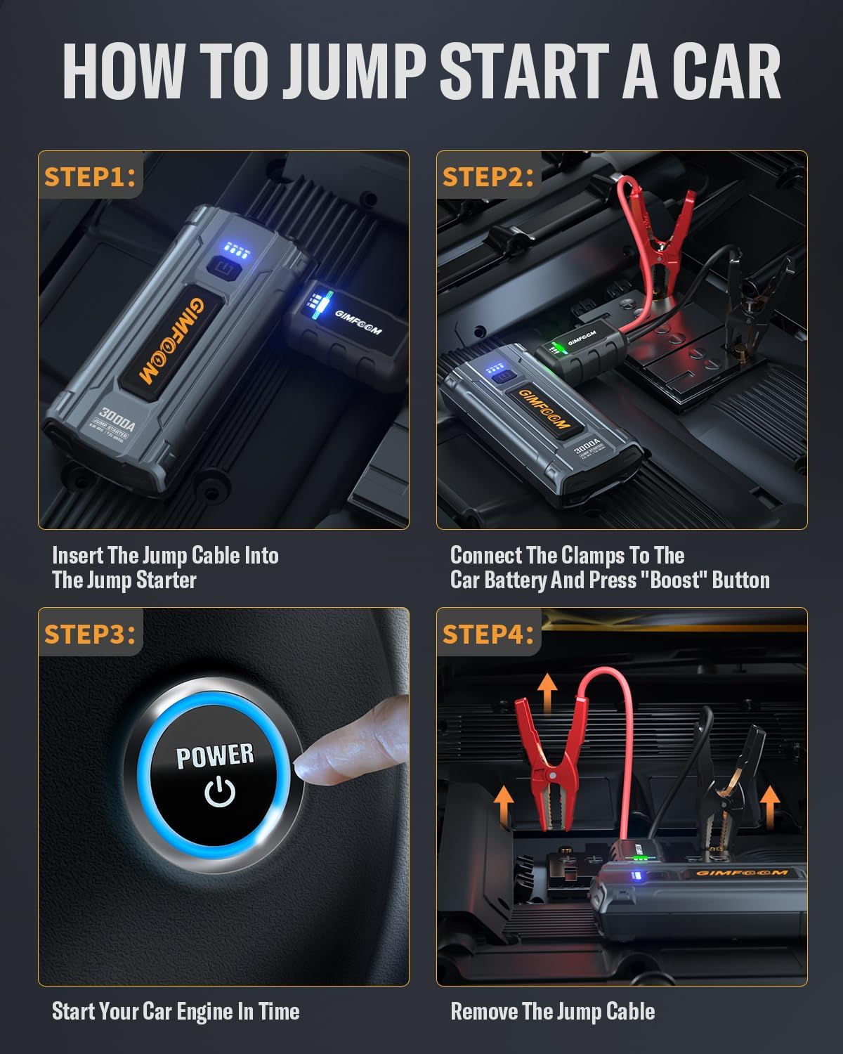 - 【POWERFUL CAR JUMP STARTER】The car battery jump starter is equipped with 3000A peak current to quickly start low voltage or completely drained car batteries. The jump starter has a 3 times enhanced current compared to the old 2nd generation and can start up to 9.0L gas and 7.5L diesel engines. Suitable for 12V cars, trucks, motorcycles, boats, RV's or lawnmowers, etc.