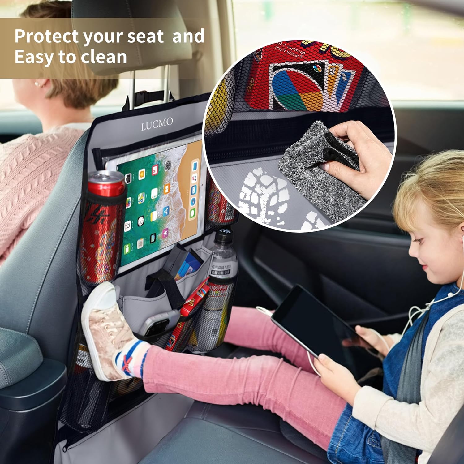 LUCMO Car Backseat Organizer with Touch Screen Tablet Holder-2 Pcs,9 Storage Pockets Car Storage Organizer Protectors Kick Mats Travel Accessories for Kids-Grey