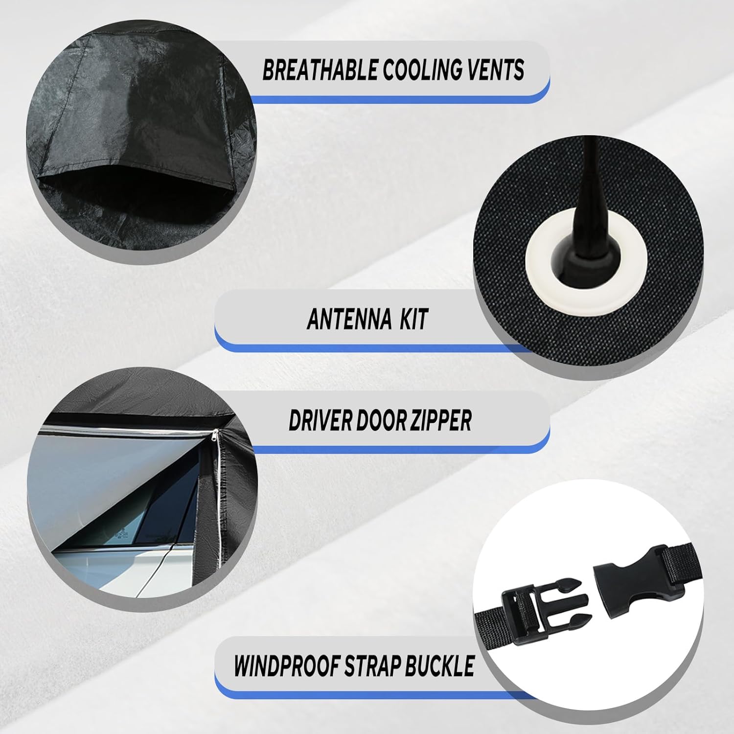 - 【Multifunctional Design】1. ATHUPEAD car cover has three buckle-type reinforced windproof straps in the front, middle, and back, which can resist strong winds. 2. There is a door zipper on the driver's side for easy access to items. 3. The unique reflective strip design reminds others at night to ensure parking safety. 4. There are vents on the side of the car cover, which can prevent moisture accumulation inside and keep it dry, allowing for faster ventilation in summer. 5. The car cover provides an antenna protection kit. If your car has a fixed antenna, you can refer to the video on YT to DIY an antenna port on the top of the car hood.