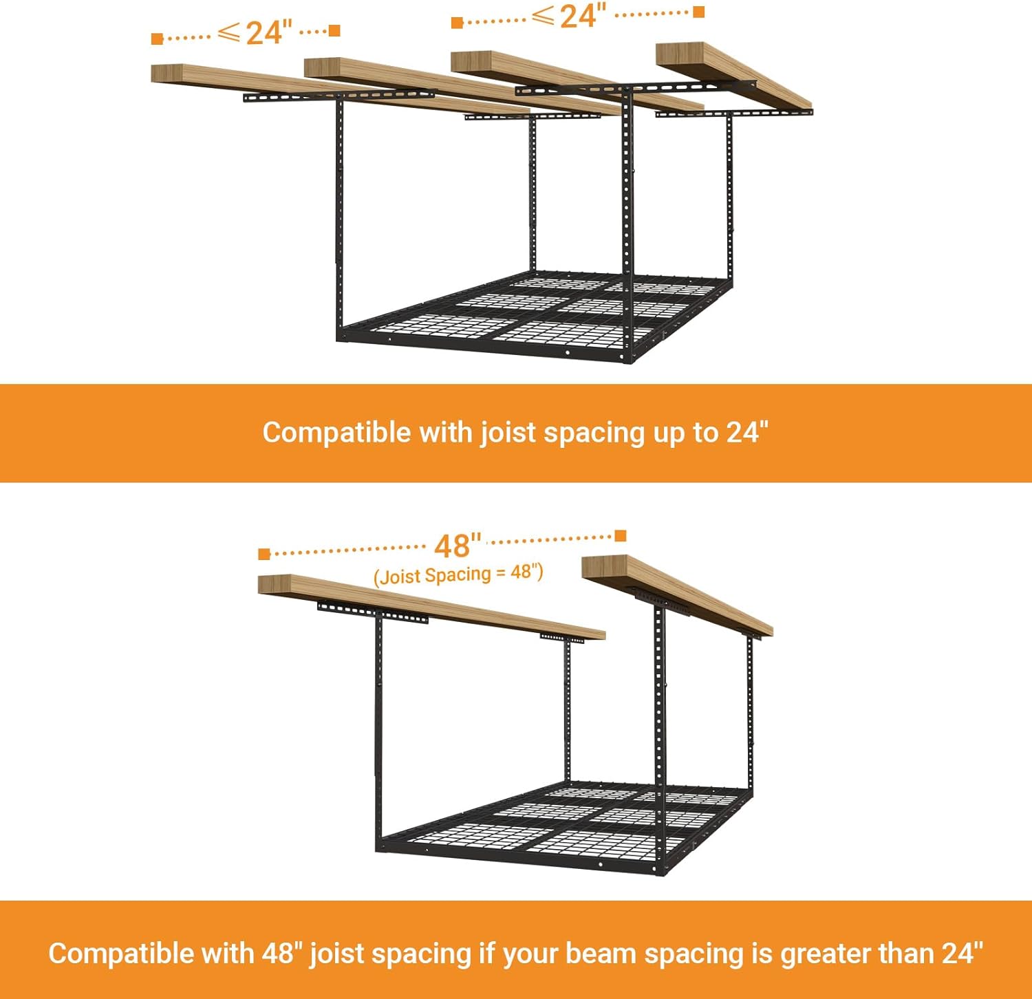 - Large Capacity: The 4x6ft overhead garage storage rack combines a weight-bearing capacity of 450 pounds, which provides a reliable storage solution.