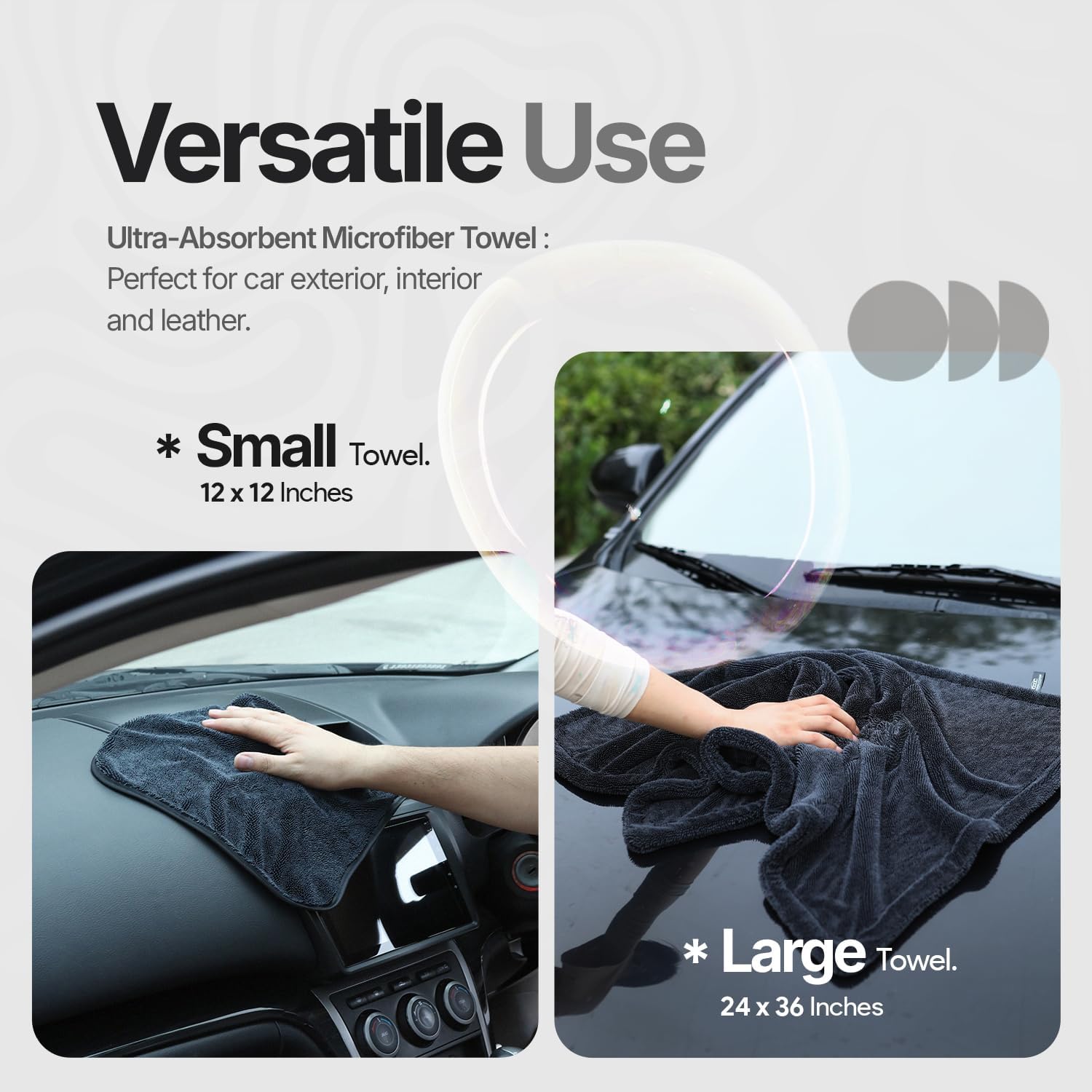 - PERFECT FOR ALL CAR SURFACES: Includes a 24x36" large microfiber towel for bodywork and a 12x12" microfiber cloth for windows, mirrors, and interior - versatile all rounder car wash towels for a spotless finish
