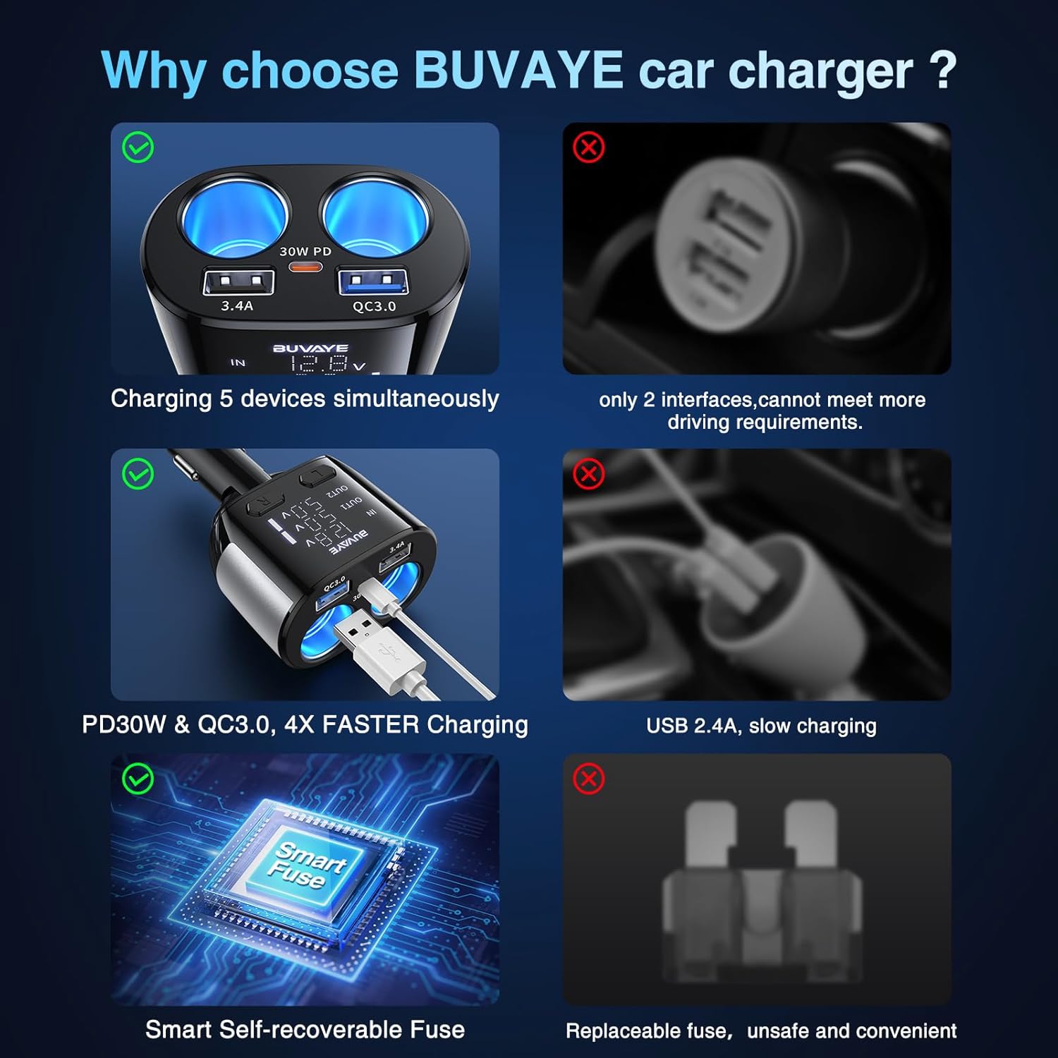 - 【BETTER Product Vision, 100% Brand Services】BUVAYE is committed to creating multi-functional car charger, turning cars into roaming charging stations, fast charging automotive electronics, mobile phones and other devices at the same time. Whether used for powering electronics or monitoring battery voltage, this car charger enhances the functionality of any vehicle's charging system, making it a valuable addition for road trips, daily commutes, and everyday use. BUVAYE Brand provides a 360-day warranty and 24 hours customer service. If you are not satisfied for any reason, please contact us and we will solve the problem for you as soon as possible. cigarette lighter usb charger