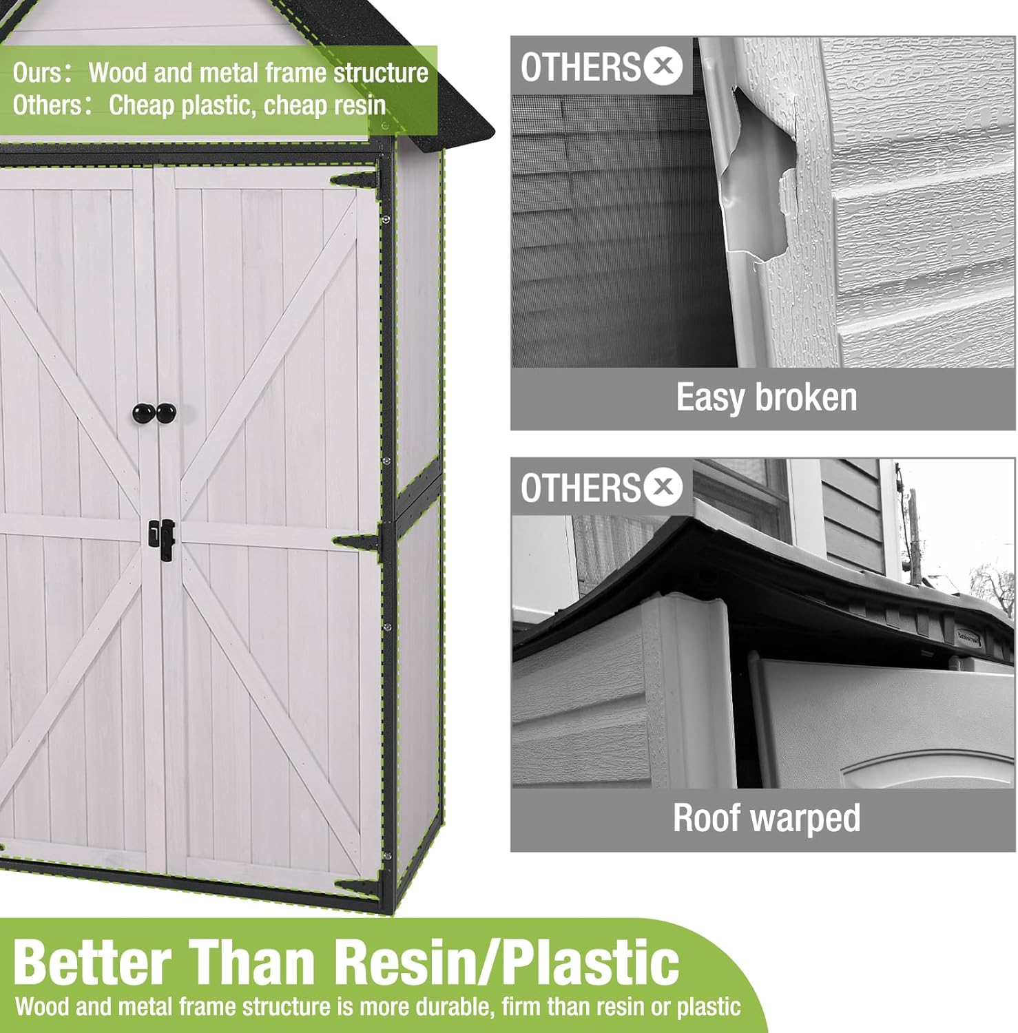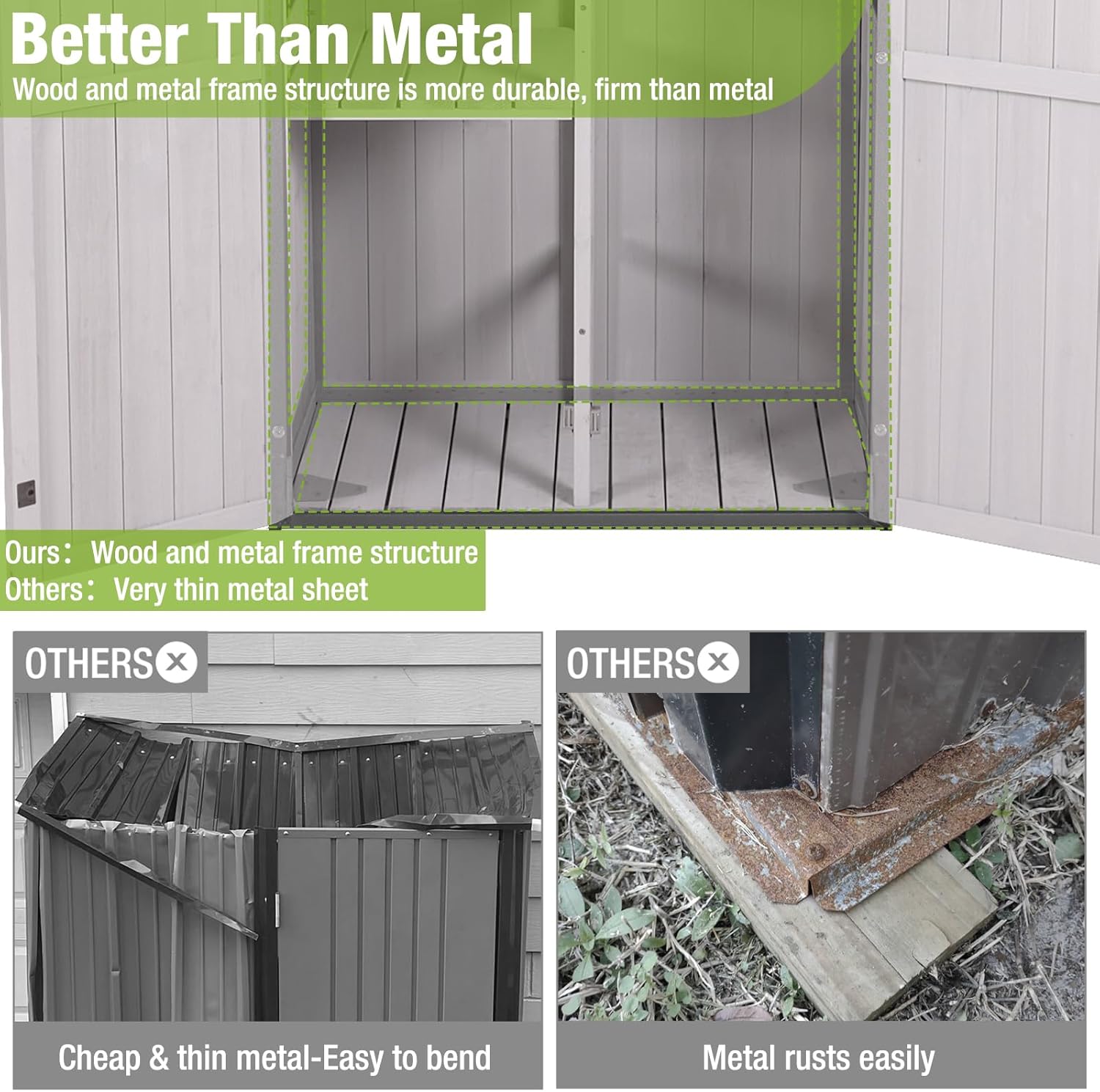 - Metal Frame And Wooden Structure: Reinforced with a robust metal frame, our outdoor garden shed offers unparalleled stability, ensuring it withstands various weather conditions for long-lasting durability.