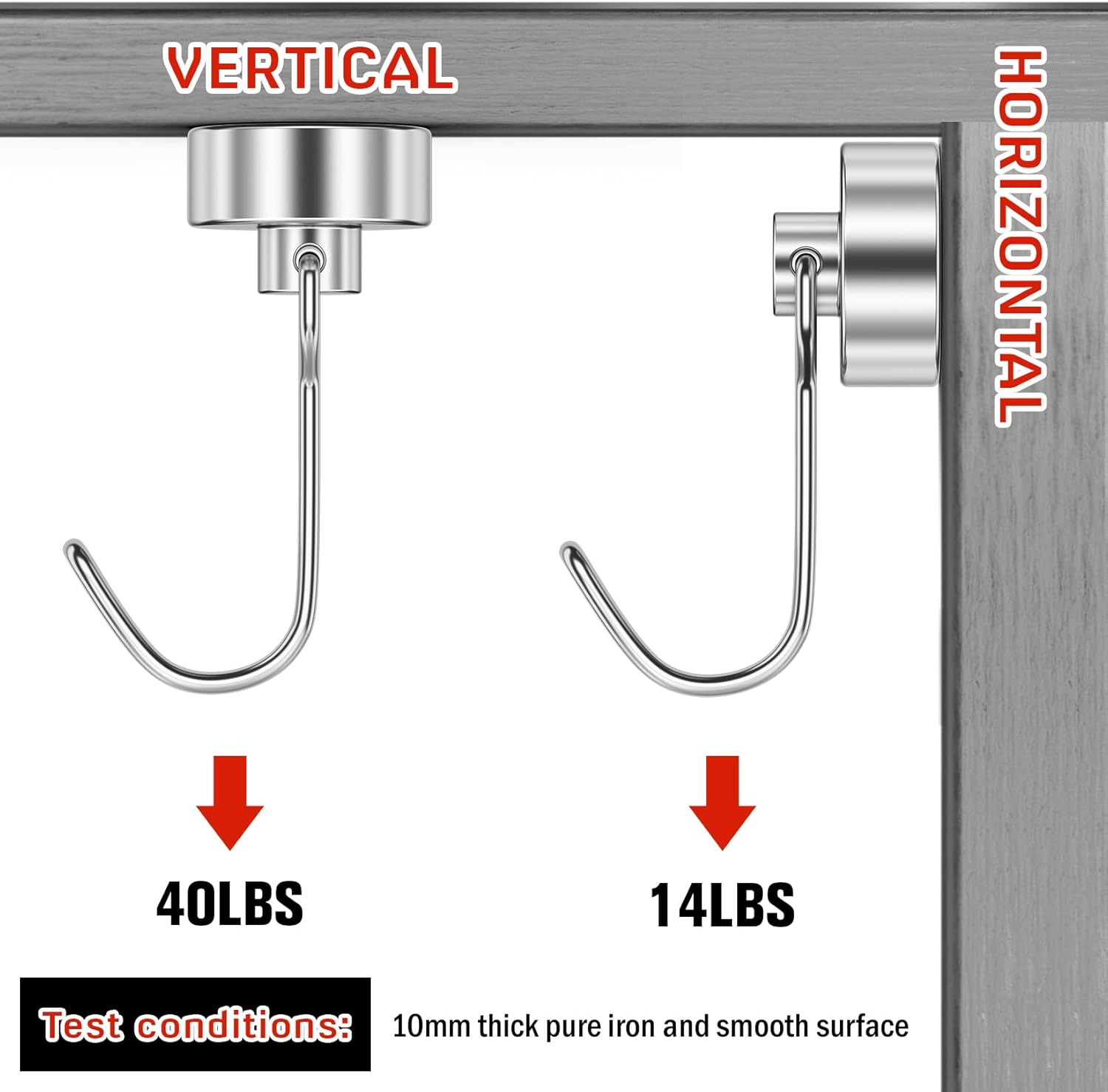 - Strong Magnetic Pull: Each Swivel Swing Magnetic hook delivers up to 40lbs+ of vertical holding force under ideal conditions. Please note: when used horizontally, the magnetic strength may decrease by approximately two-thirds. For best results, attach to flat, smooth, and clean metal surfaces to ensure maximum grip.