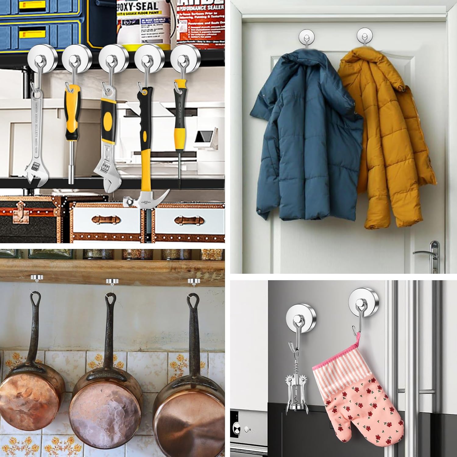 - Durable Build with Polished Finish: Crafted with N52 Grade neodymium magnets and a steel base, each hook features a mirror-like nickel coating that resists rust, corrosion, and scratches. The sleek finish not only adds durability but also maintains a clean, professional look for long-term use.