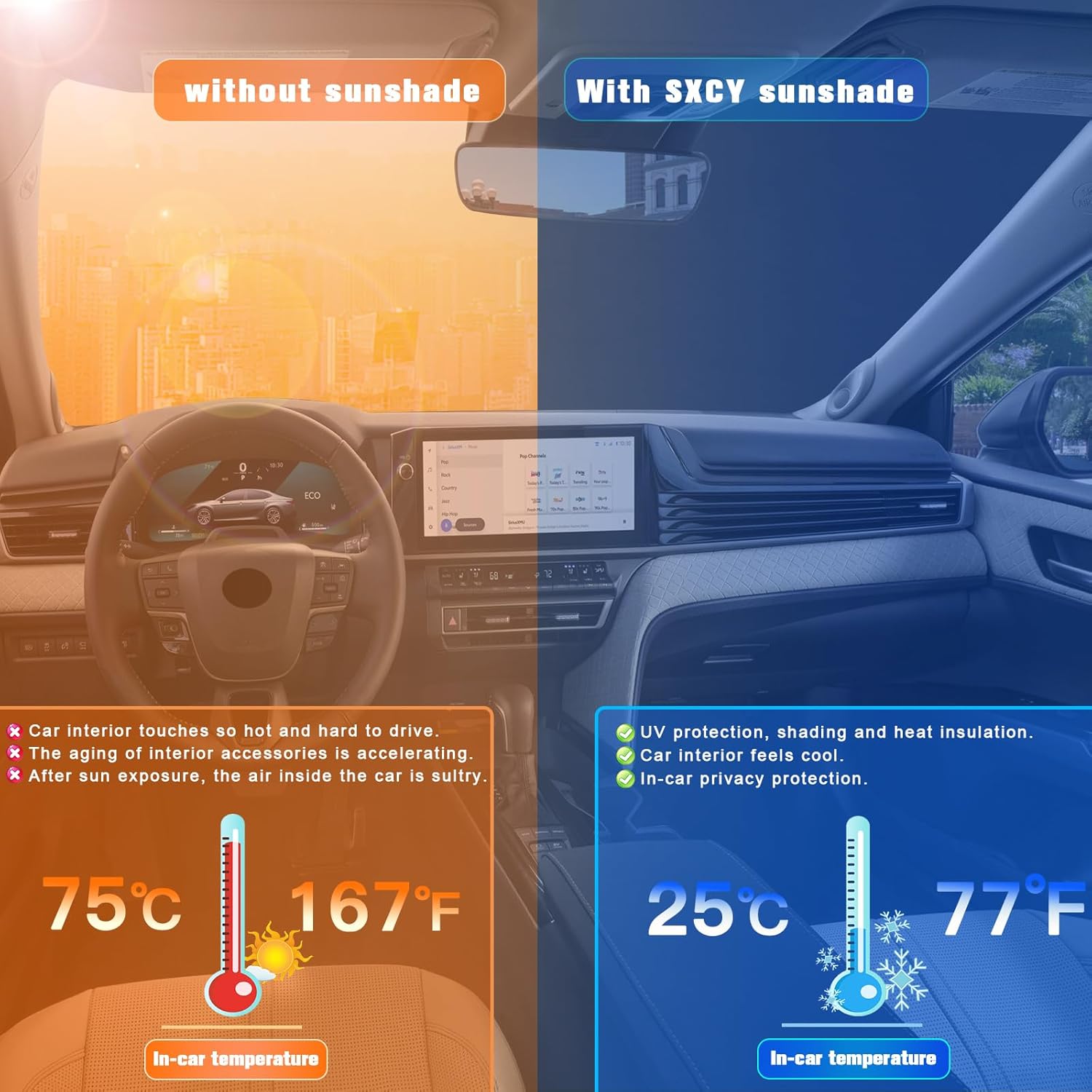 - 4.All-Season Protection: In summer, the sunshade keeps your car cool by blocking strong UV rays and heat. In winter, it continues to protect against harmful UV rays under clear skies. This Camry sun visor is essential for sun and UV protection year-round