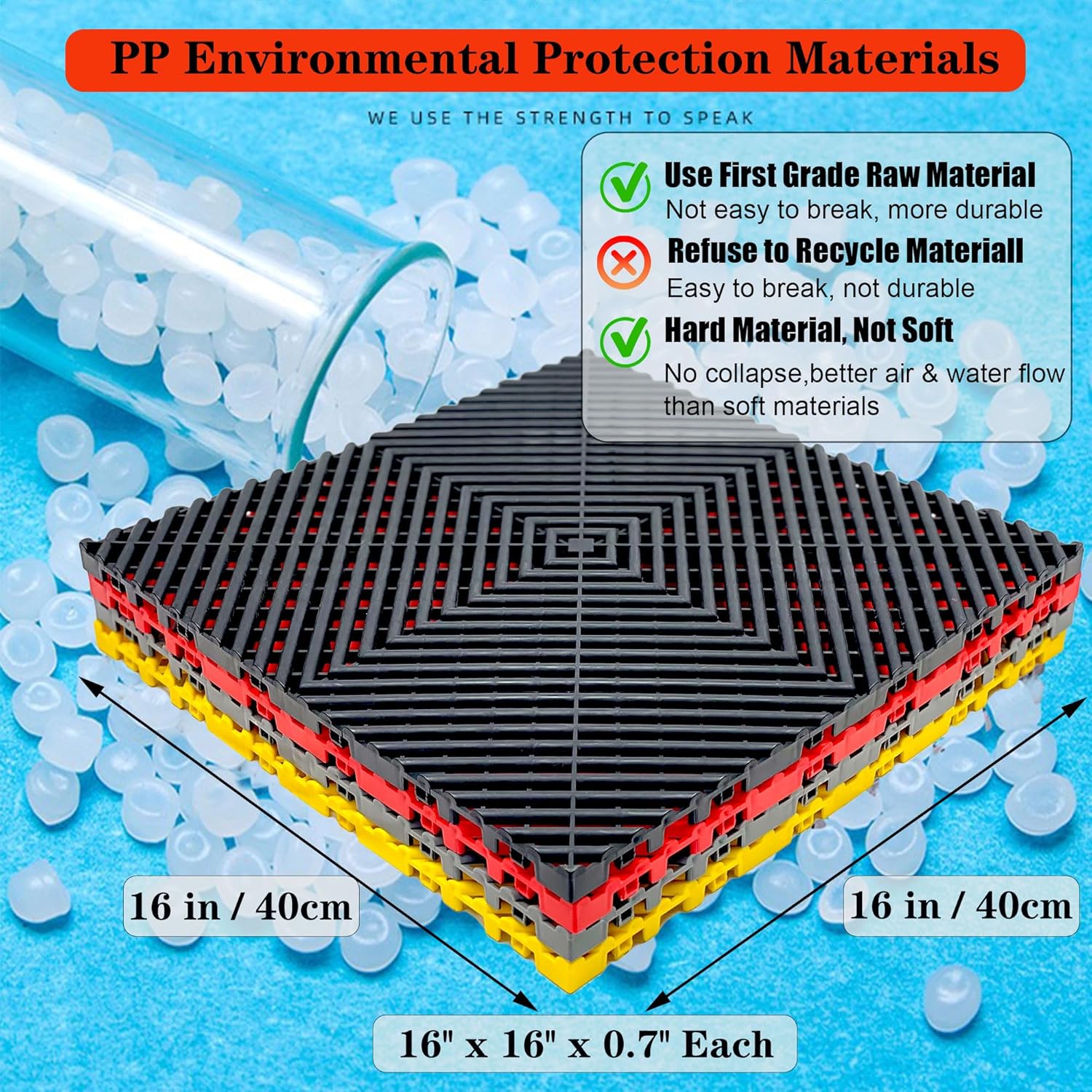- What You Get: Including 24 durable square drain mats, each measures 16''L x 16''W x 0.71''H.Total area 41.3 square feet