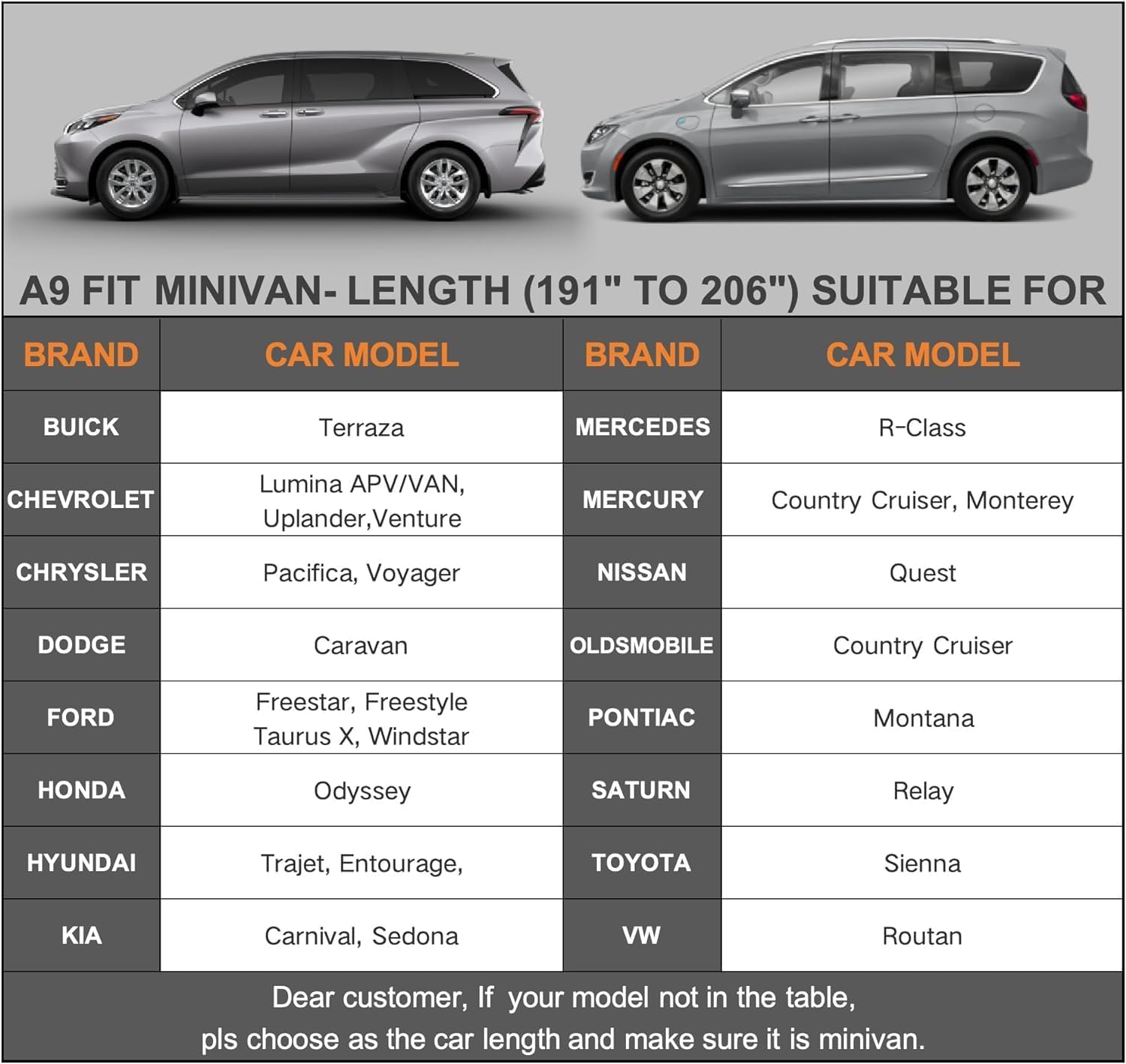 - 【Dimension A9】- Universal fit for Minivan / Station wagon,MPV which length is 191-206 inch. (NOT FOR SEDAN/SUV). Such as honda odyssey, Toyota sienna, Chrysler pacifica/town&country/Voyager, Dodge Grand Caravan, Volvo v90 etc. Come with a large enough waterproof portable storage pocket to store the cover.