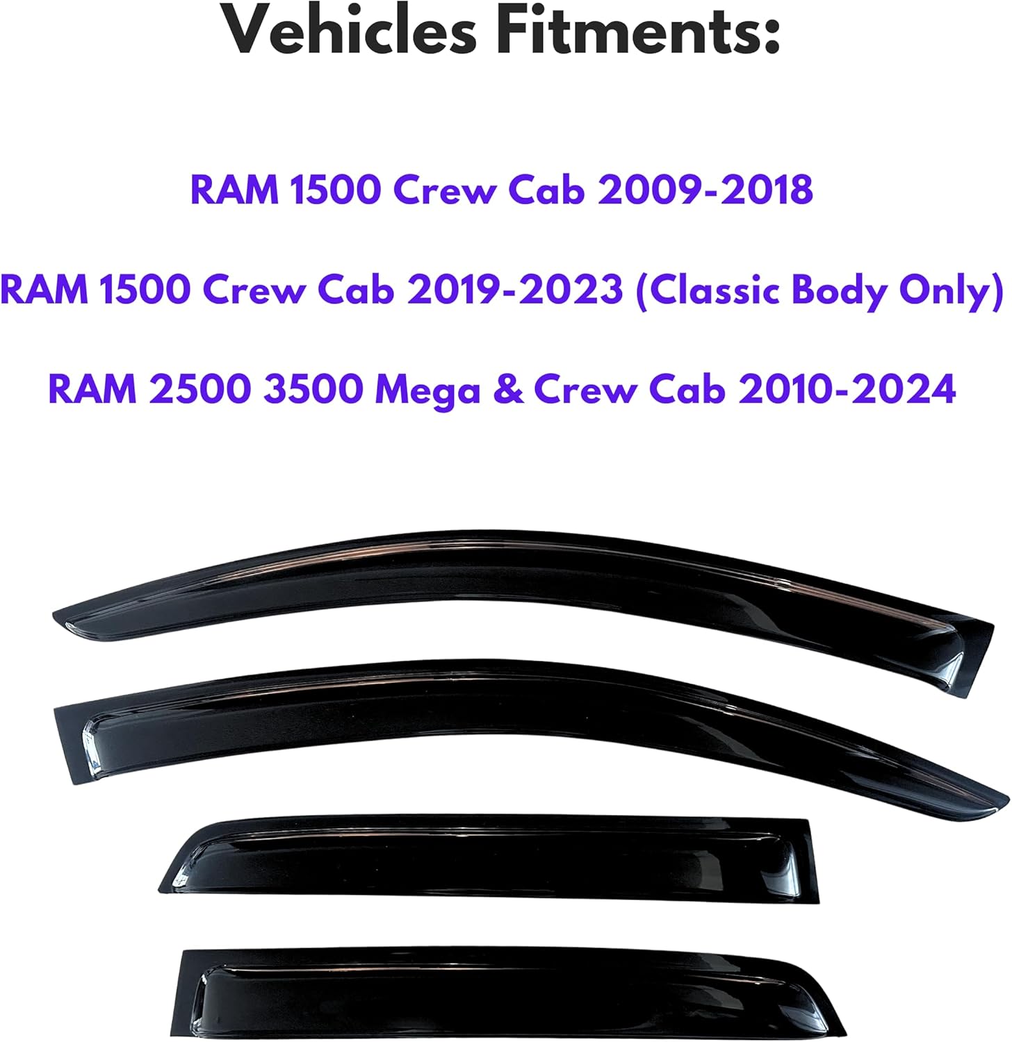 - 【Perfect Fit】KPY window visors rain guards vent deflectors compatible with 2009 2010 2011 2012 2013 2014 2015 2016 2017 2018 Dodge Ram 1500 Crew Cab, 2010 2011 2012 2013 2014 2015 2016 2017 2018 2019 2020 2021 2022 2023 2024 Ram 2500/3500 Crew Cab & Mega Cab, 2019 2020 2021 2022 2023 2024 Ram 1500 Classic Crew Cab. ( 4 Full-Size Doors)