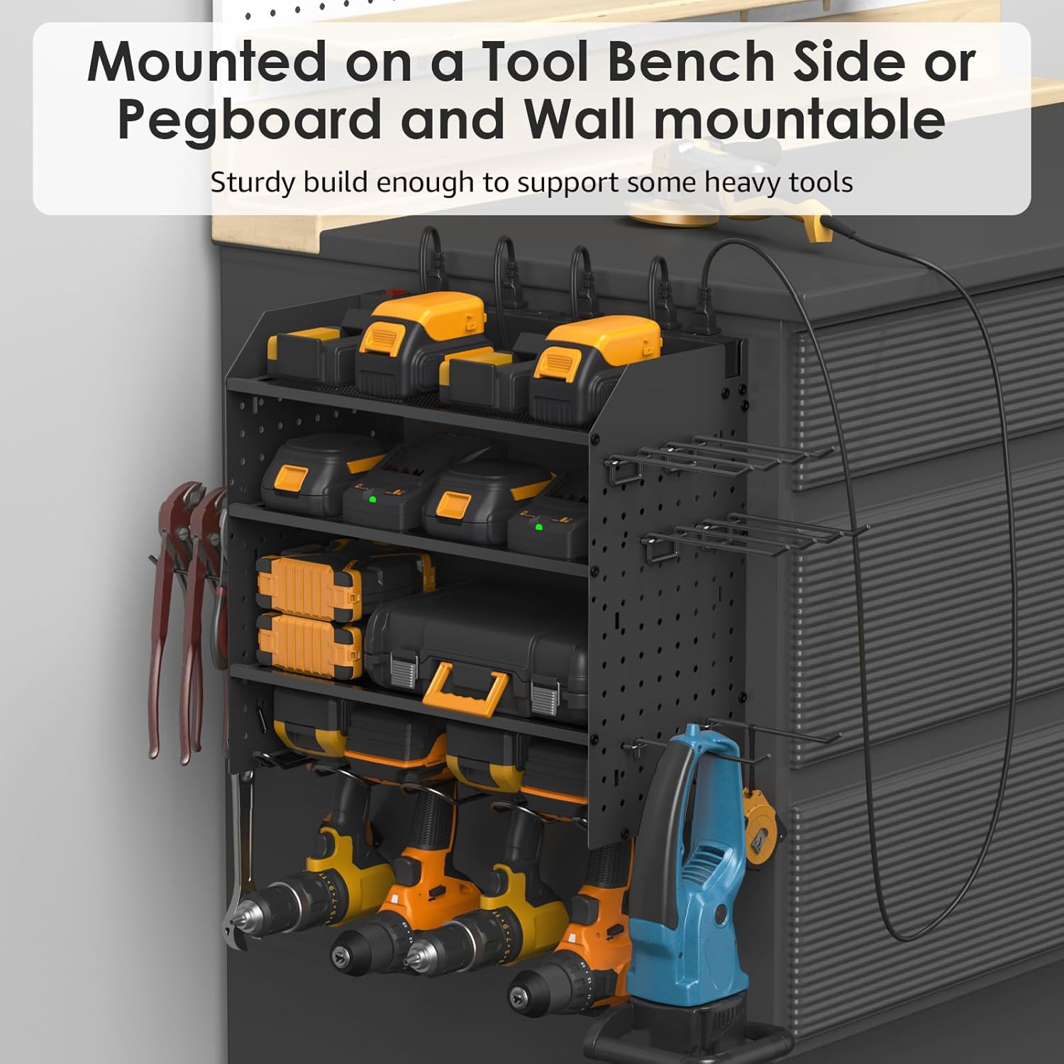 - Black wall mount power tools organizer with power strip, pegboard design, 4 slots, 4 hooks, 4 long pegboard hooks, 4 double pegboard hooks, 4 layer structure shelf and one layer adjustable for actual needs, can keep rechargeable tools organized in the work area and save your bench space.
