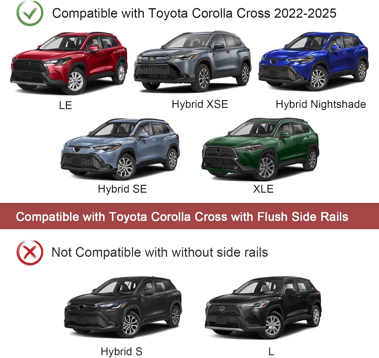 - 【Excellent fit】These roof rack crossbars are specifically replacements for Toyota Corolla Cross 2022 2023 2024 2025 LE XLE & Corolla Cross Hybrid SE XSE Nightshade (WITH FLUSH SIDE ROOF RAILS). Note: Not for L/Hybrid S. Please make sure it fits your vehicle before purchasing. (Not Block the Sunroof).