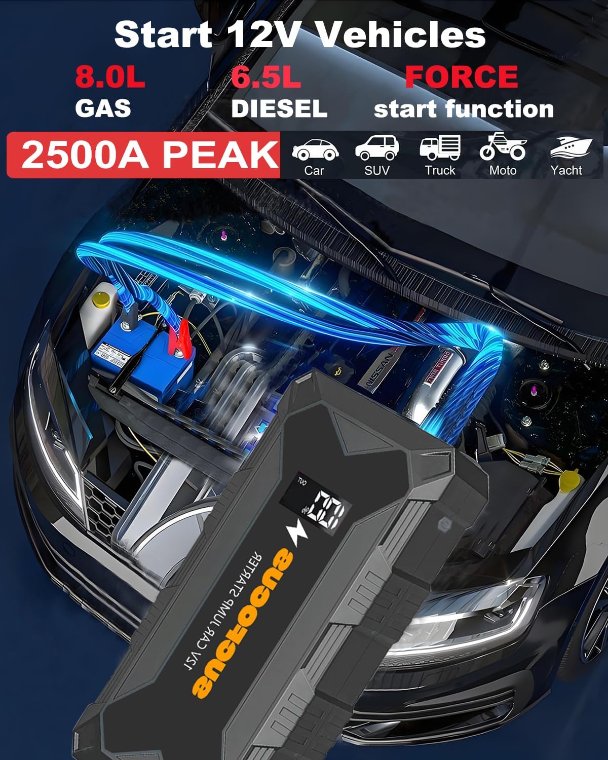 - 【More Powerful Jump Starter】SUCFOCUS jump starter battery pack can quickly jump start a dead car battery. Even if the battery voltage is too low, pressing the "RST" button ( Top right corner on back of the connector) will force the car to restart. With boosted 2500A peak current, the SUCFOCUS car battery jump starter can restart your 12V vehicles (Up to 8.0L gas/6.5L diesel engines) in seconds with a 45 C high-rate lithium battery. Suitable for cars, trucks, motorcycles, SUV, ATV, UTV, dirt bike, snowmobile, boats, lawnmowers, trailer, RV, tractor and so on. Up to 20 jump starts on a single charge.