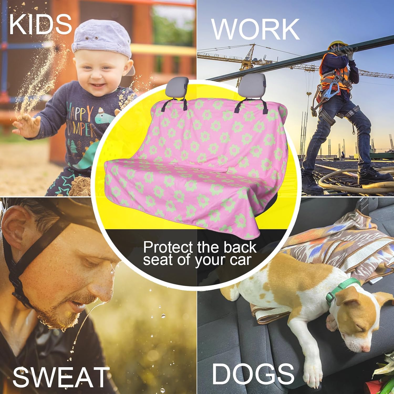 - Made From 3 Layer Material: (Front) Flower and pink pattern printed on towel cloth, which gives the rear seat cover a good look and a super long life. It is perfect for leather or upholstery back seats. (Middle) Waterproof fabric that is designed to guard your backseat against moisture and sweat. (Back) This rear seat cover are designed with a non-slip backing fabric that's super comfortable and won't slip off your back seat.