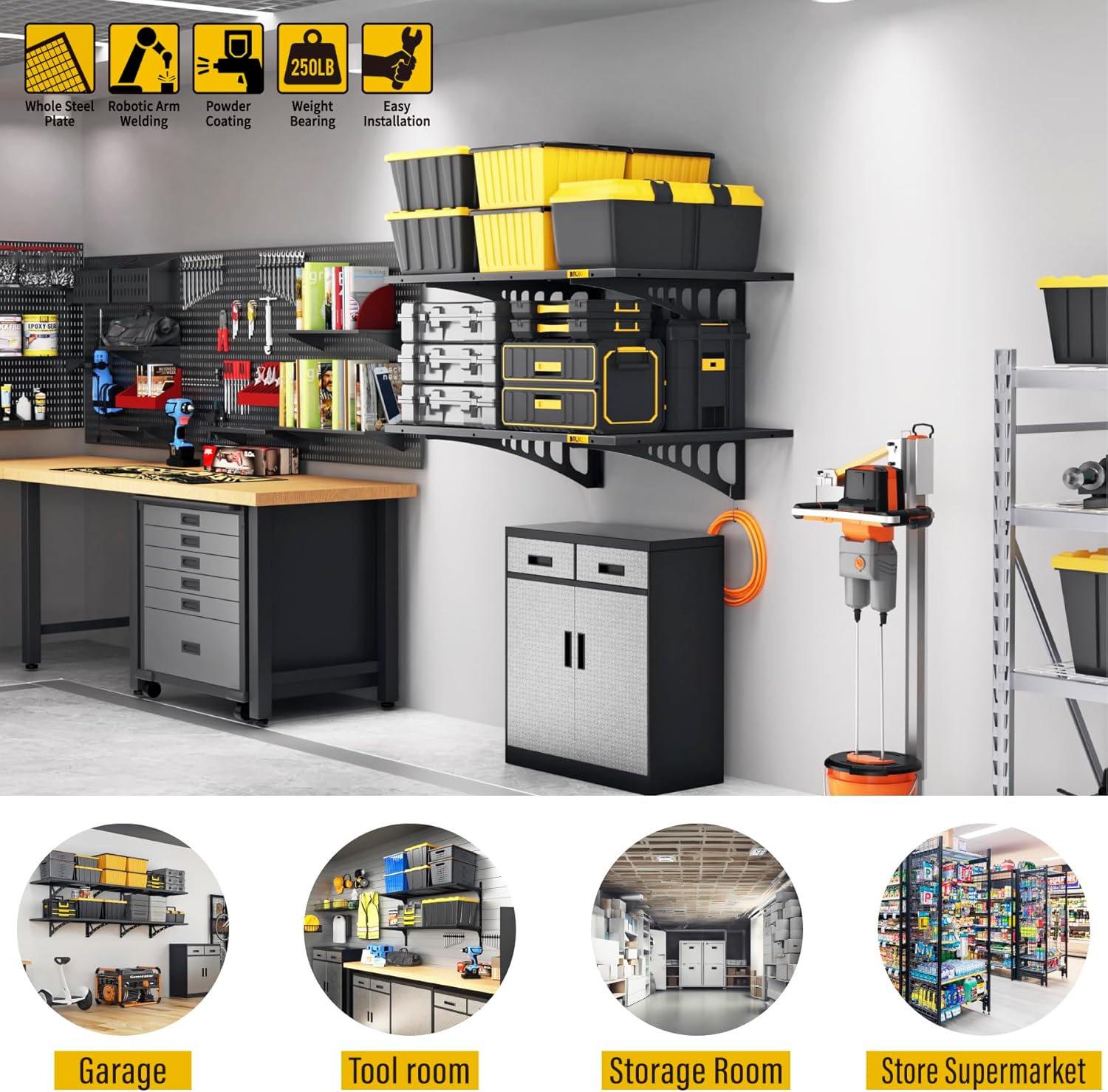 - SUPERIOR DESIGN: Wall shelf garage storage rack is made of heavy-duty frame structure and thicker wire mesh combined with welding, the panel and bracket connection is adjustable slide rail design, Both ends of the bracket can be installed freely in the 8"-45" range of wood wall keel spacing. Eliminating the worry of not being able to connect due to the mismatch of the spacing of the load-bearing wooden wall keel