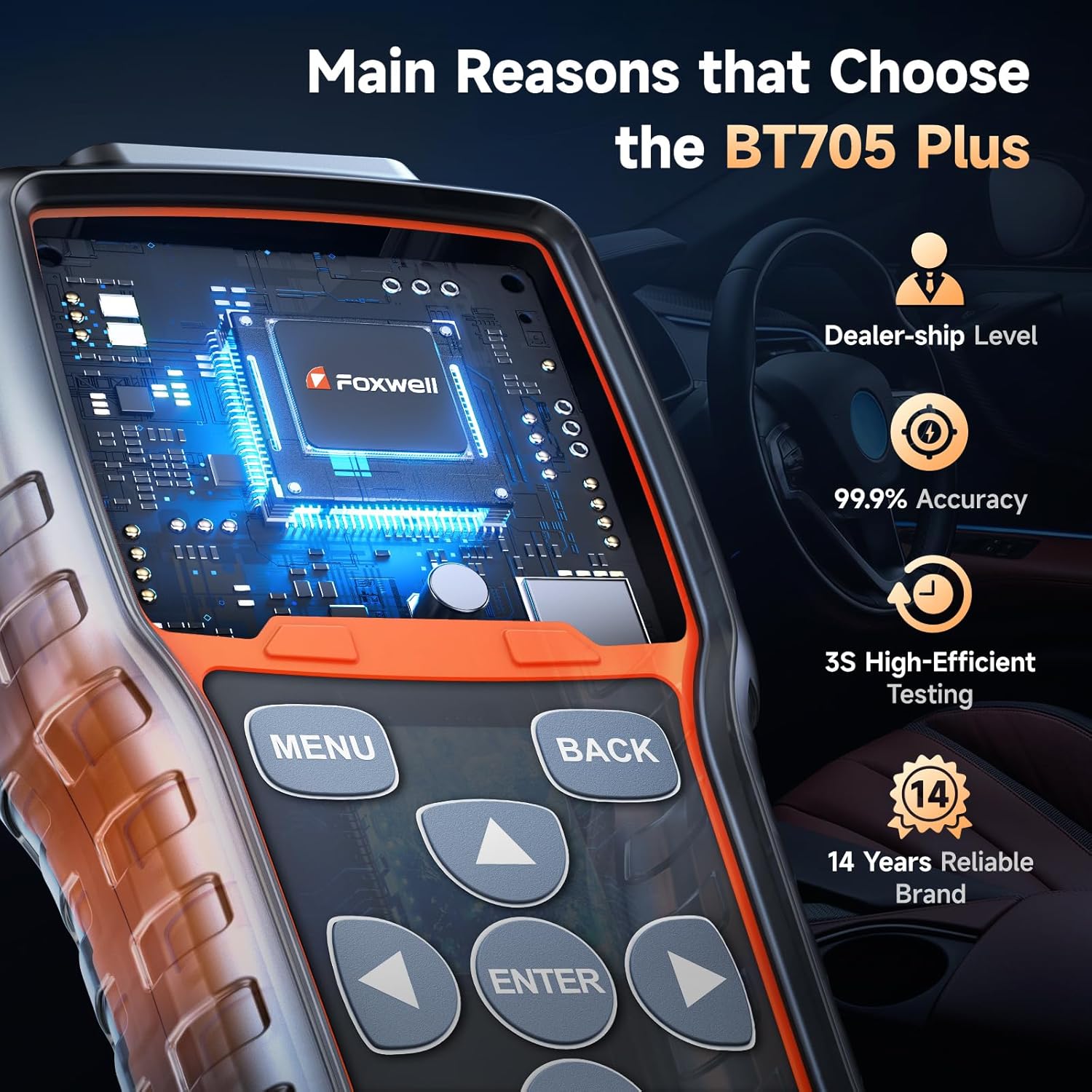 - Enhanced Version of BT705: More than a visual upgrade, BT705 Plus features a faster chip and smarter algorithm that boost testing speed by 30%. It also improves accuracy under testing conditions such as low battery charge or unstable alternator output. The upgraded color LCD ensures results are easy to read in any light. You can test battery, cranking, or charging systems individually—no set sequence required. With a 5.9" cable, even solo testing from the driver’s seat is simple. Designed for professionals and DIYers Note: Works with regular flooded, AGM, spiral, and GEL batteries
