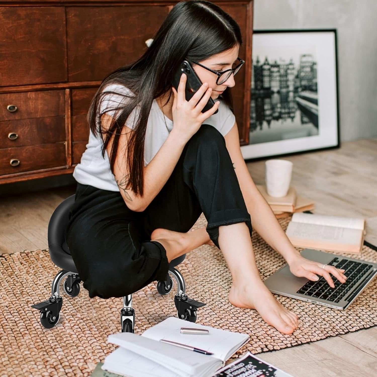 - ✨【High-Quality】Low rolling stool with backrest is made of PU leather material, which is waterproof durable and easy to clean. Soft and comfortable seat cushion and backrest, thickened sponge filling will feel comfortable during sitting. and restored prototype quickly when the weight depart.