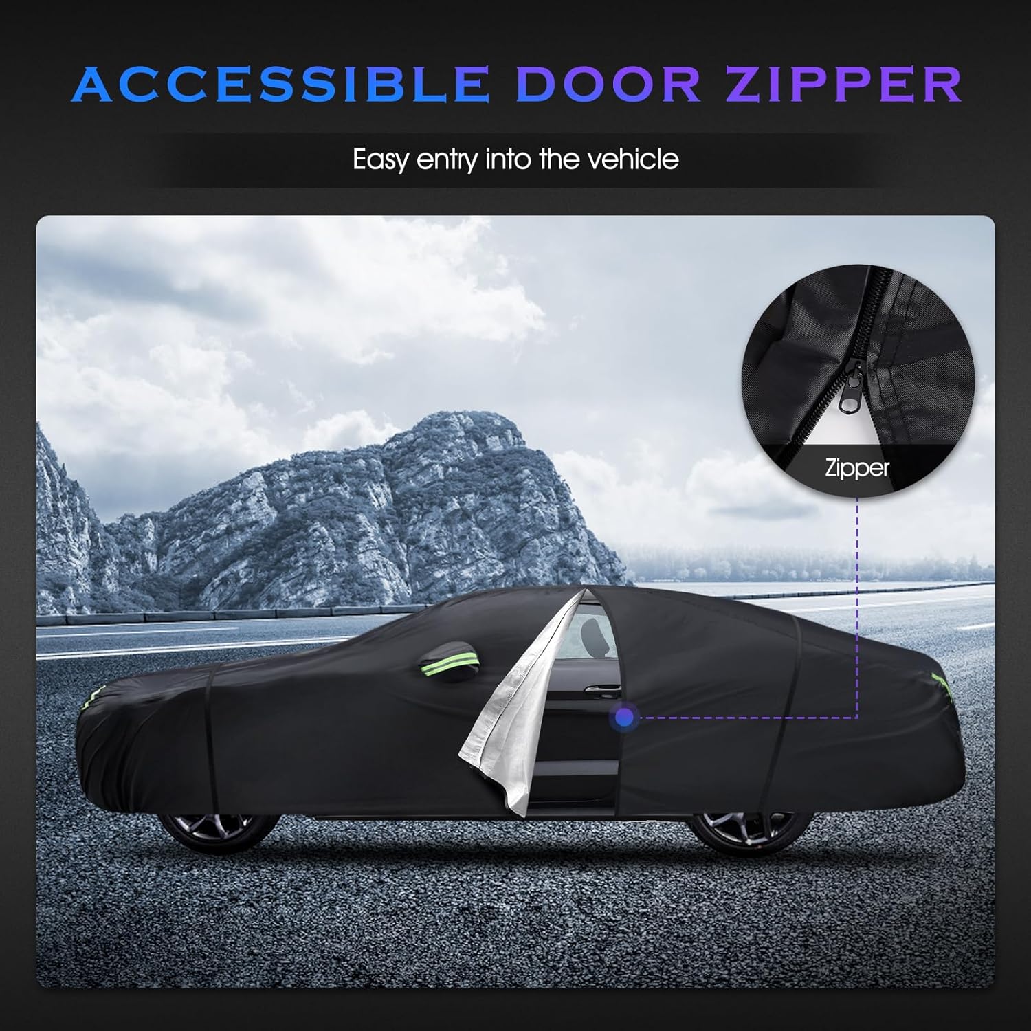 - 【Convenient and save time and space】: Our car cover easy to install and remove, making it convenient to use. and with a waterproof bag, making it easy to fold and carry in your trunk without taking up extra space;Accessible door zipper,easy entry into the vehicle