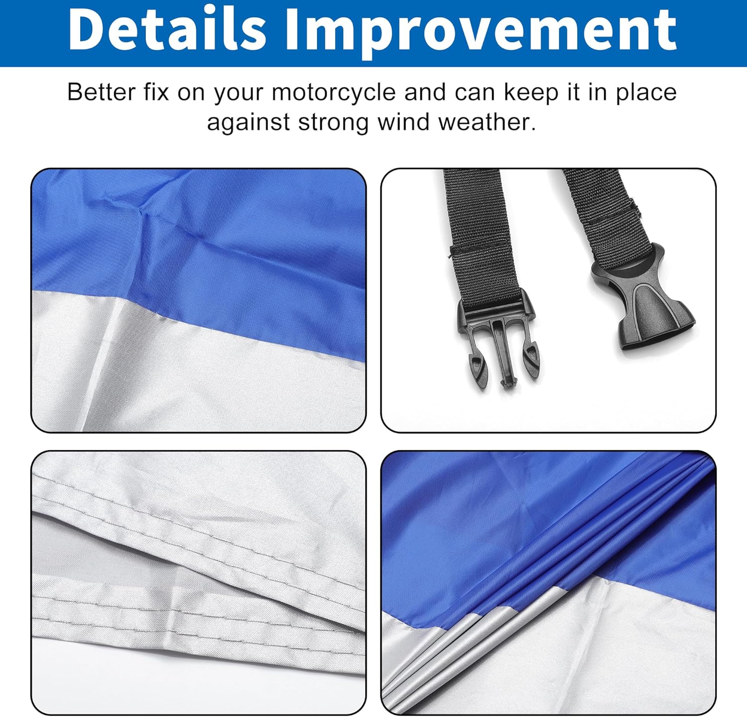 - Waterproof Windproof Upgrade: The motorcycle cover is made from 190T polyester, with the seam applied with PU glue, so it is rainstorm-proof. Adjustable Elastic Band at the lower hem of the cover can press the cover against the motorcycle body closely. In addition, there is a buckle at the bottom to prevent the cover from being blown away.