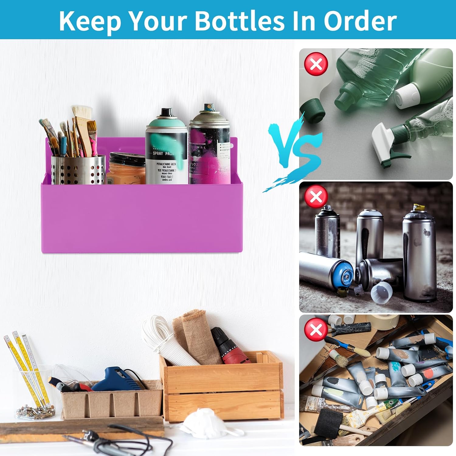 - Easy-to-Use and Clean: The spray can holder can hold at least 3 aerosol bottles within 3" diameter. The size is 8.3" x 2.8" x 3". Featuring an open design, this tool box allows for effortless tool retrieval and easy cleaning. Simply get what you need and go to work. Maintain a neat and organized workspace with ease.