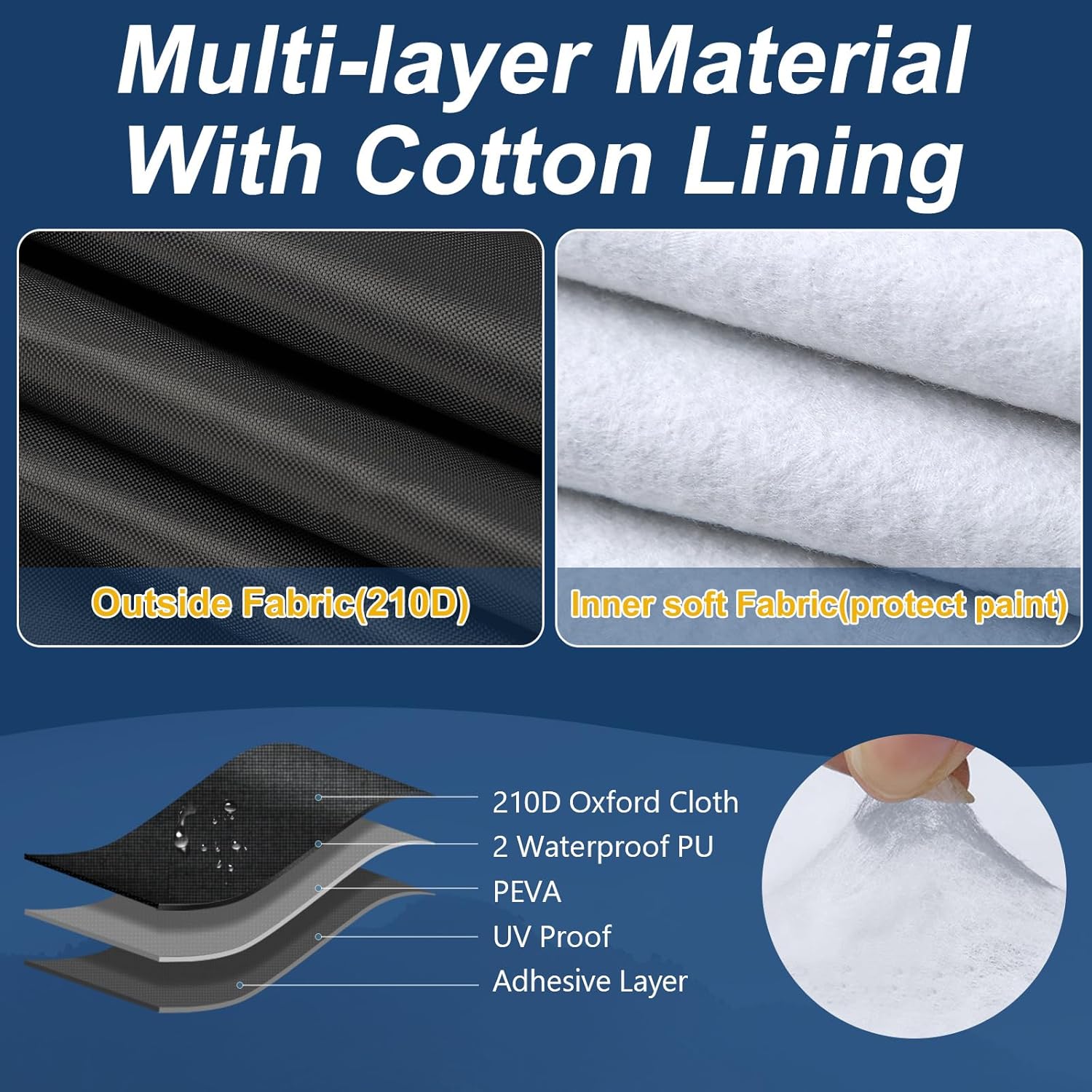 - 【All-Weather Protection】Made black 210D Oxford cloth and cotton lining as material, ensuring its quality is tough, durable, and safe in strong wind conditions. Protects your vehicle and paint from rain, snow, sun, bird droppings, pollen, dust/dirt - suitable for all seasons.