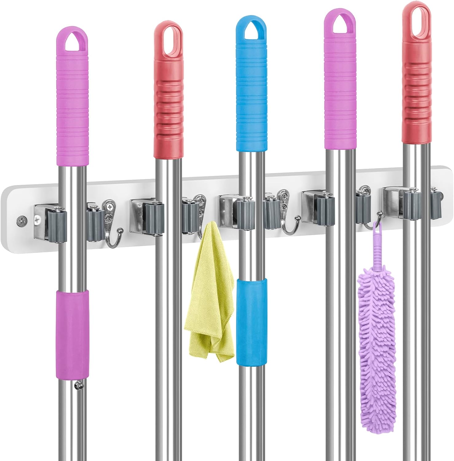 - HOME ESSENTIALS: Broom hanger is a great addition to your laundry room. Helps to keep all mops, brooms, flyswatter and anything else you have to hang all in one place. Mop holder grip everything tightly and securely without slip. Much better way to neatly store items you need for cleaning up and handy as well.