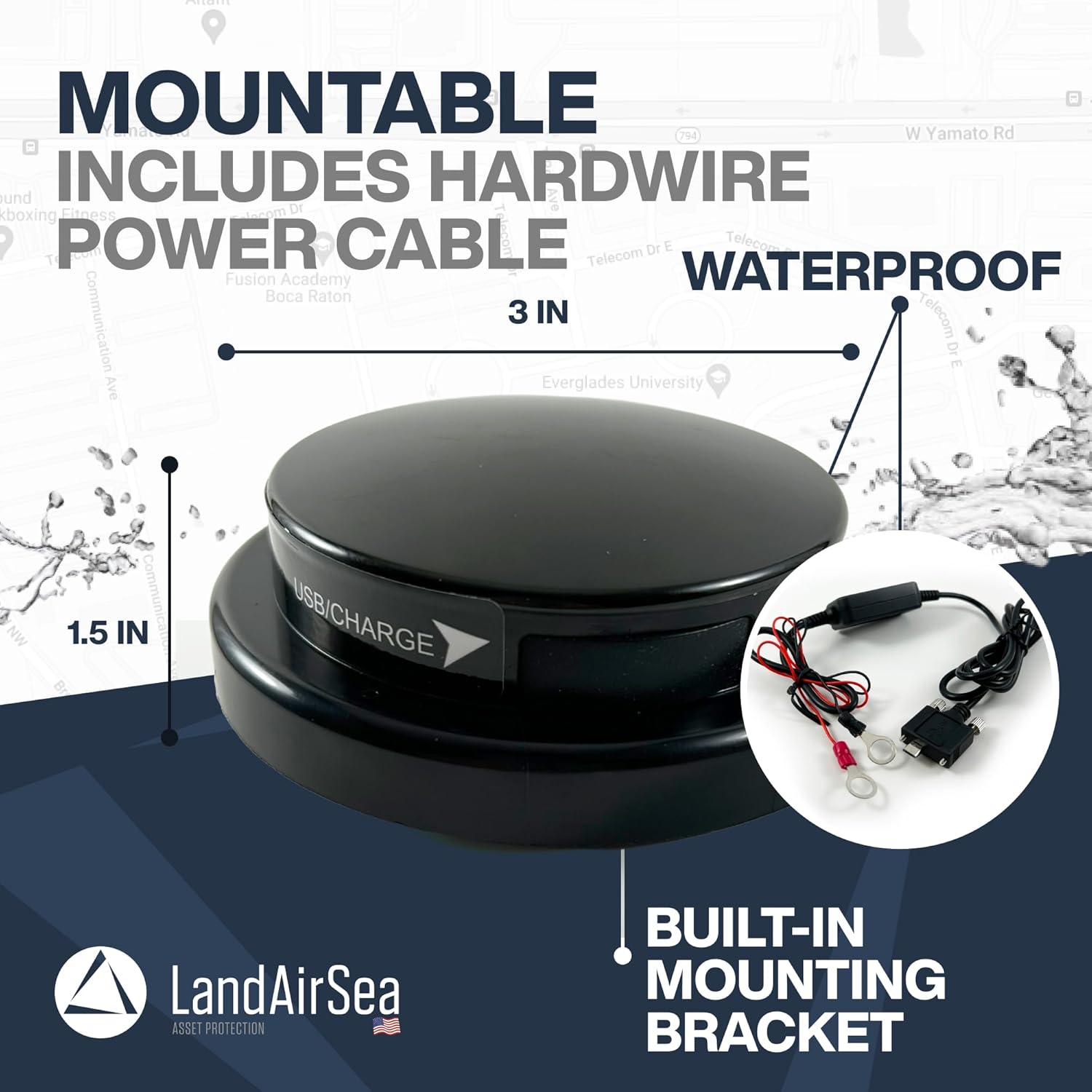- Special Feature : Geo-Fence, Motion Activated, Mountable w/ Hardwire Cable, Real Time Tracking, Waterproof