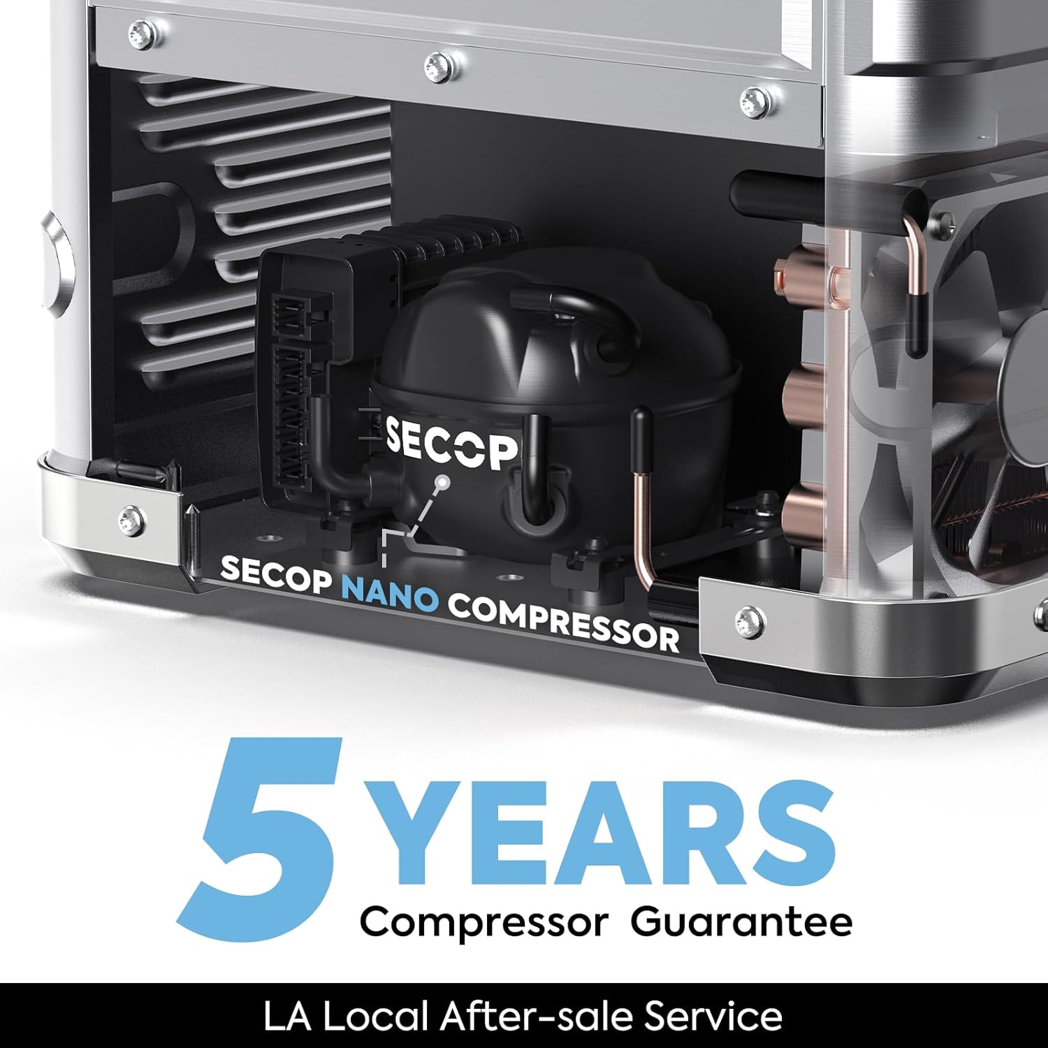 - [SECOP Nano Compressor] This 12v freezer Cooling range from -4°F to 68°F(-20℃~20℃) to meet all your freezing or refrigeration need. MAX mode for fast cooling and ECO mode for energy saving. With the SECOP smallest compressor, it weighs only 32 lbs, but is very consistent in performance.