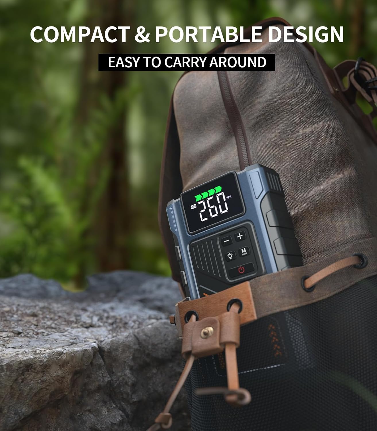 - 150PSI PORTABLE CORDLESS AIR TIRE PUMP - Not only a portable jump starter booster pack, but also an air compressor that with preset 4 inflation mode & auto shut-off function,support to fill a flat car/motocycle/bikecycle tire, balls and pool toys, allows PSI KAR BAR unit switch