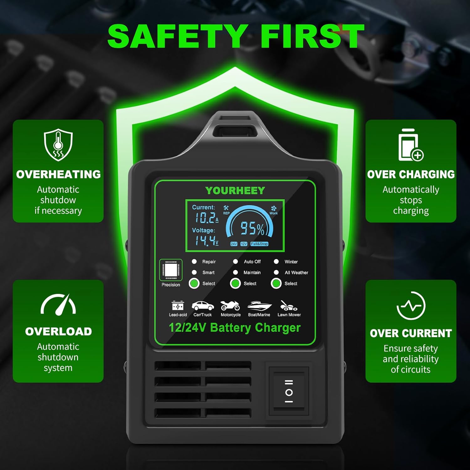- 【Professional-Grade Battery Charger】Engineered with military-grade 13.1LB pure copper coils and heavy-duty aluminum alloy casing, the Yourheey Car Battery Charger delivers unmatched durability and 30% faster heat dissipation. This 12V 24V Battery Charger Automotive masterfully handles all lead-acid battery types - AGM, GEL, Flooded, EFB, Calcium, MF, and deep-cycle batteries (Note: Not compatible with lithium/LiFePO4). Its 15A max output ensures rapid charging for trucks/RVs while maintaining precision for motorcycles/lawn equipment. cargador de batería de carro