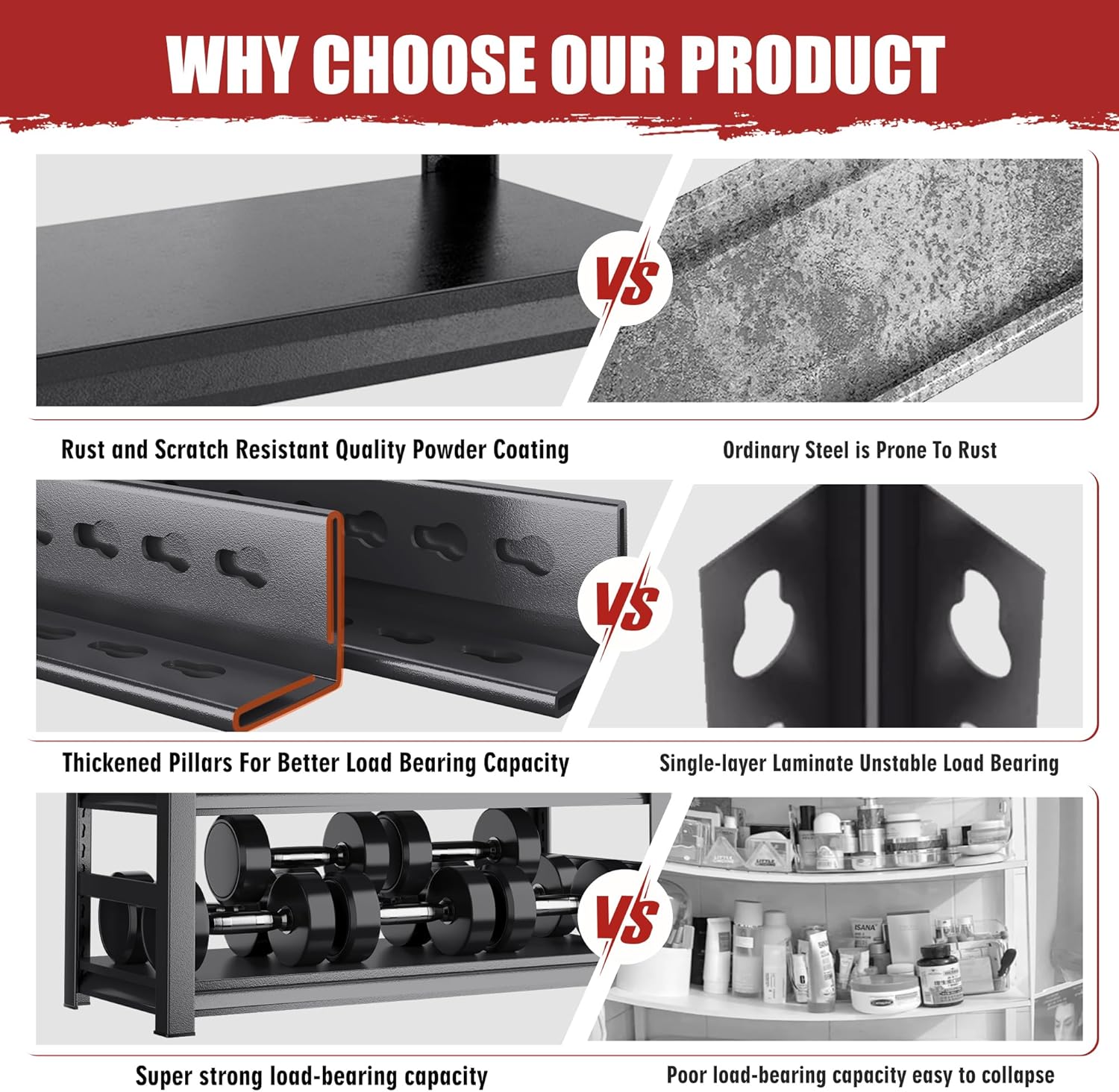 - 【Extremely Sturdy & Durable Garage Shelving】Constructed from high-strength premium cold-rolled steel with advanced powder-coated technology, this metal garage shelving unit resists rust, oxidation, and wear. The industrial-grade coating not only enhances aesthetics but also boosts durability, making it a heavy duty garage shelving solution for long-term use