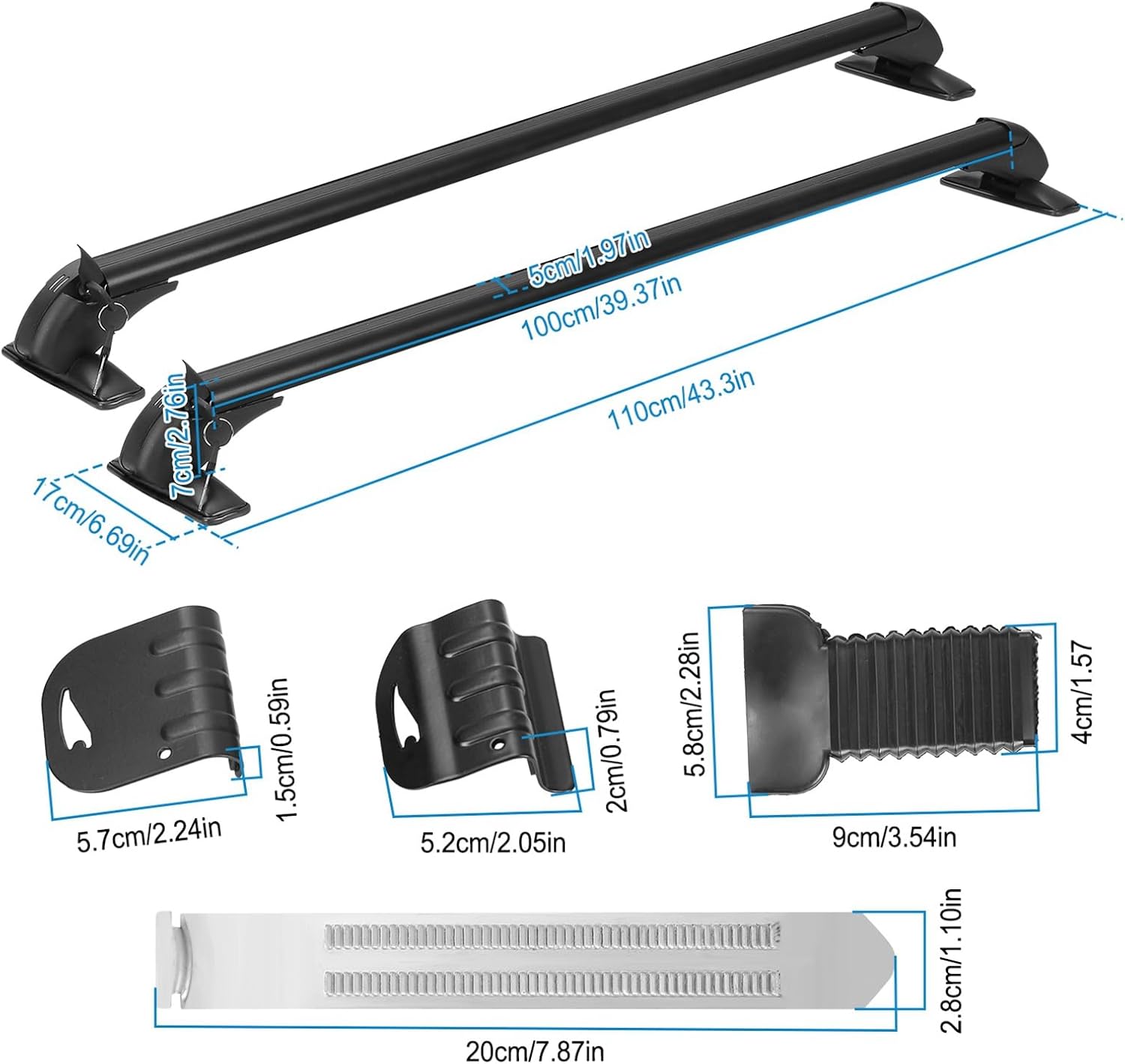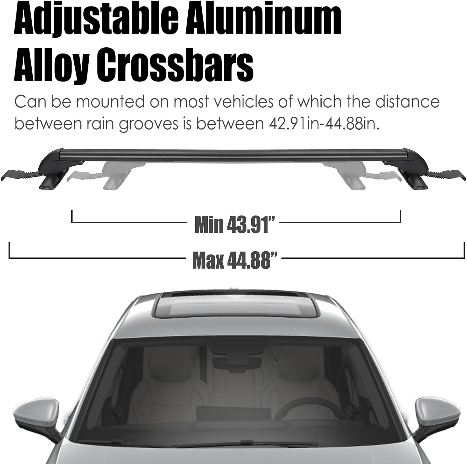 - 【UNIVERSAL ROOF RACK CROSSBARS】: Can be mounted on most vehicles which the distance between the rain grooves is between 109cm-114cm/42.91in-44.88in to carry bike, kayak racks, cargo frame, cargo boxes, snowboard, surfboard, etc.