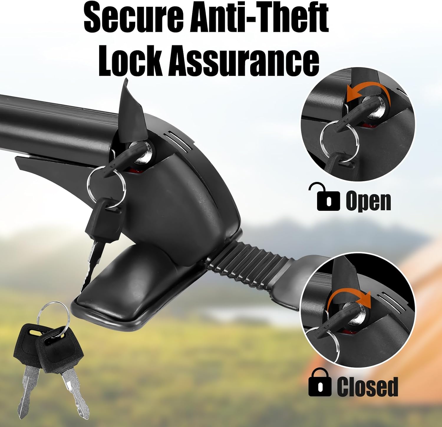 - 【ANTI-THEFT LOCK DESIGN】: Each across bar comes with an anti-theft lock to ensure the security of the cross bar and coming with a durable ABS cover to protect the keyhole from bad weather. Once locked, it remains steady and secure.