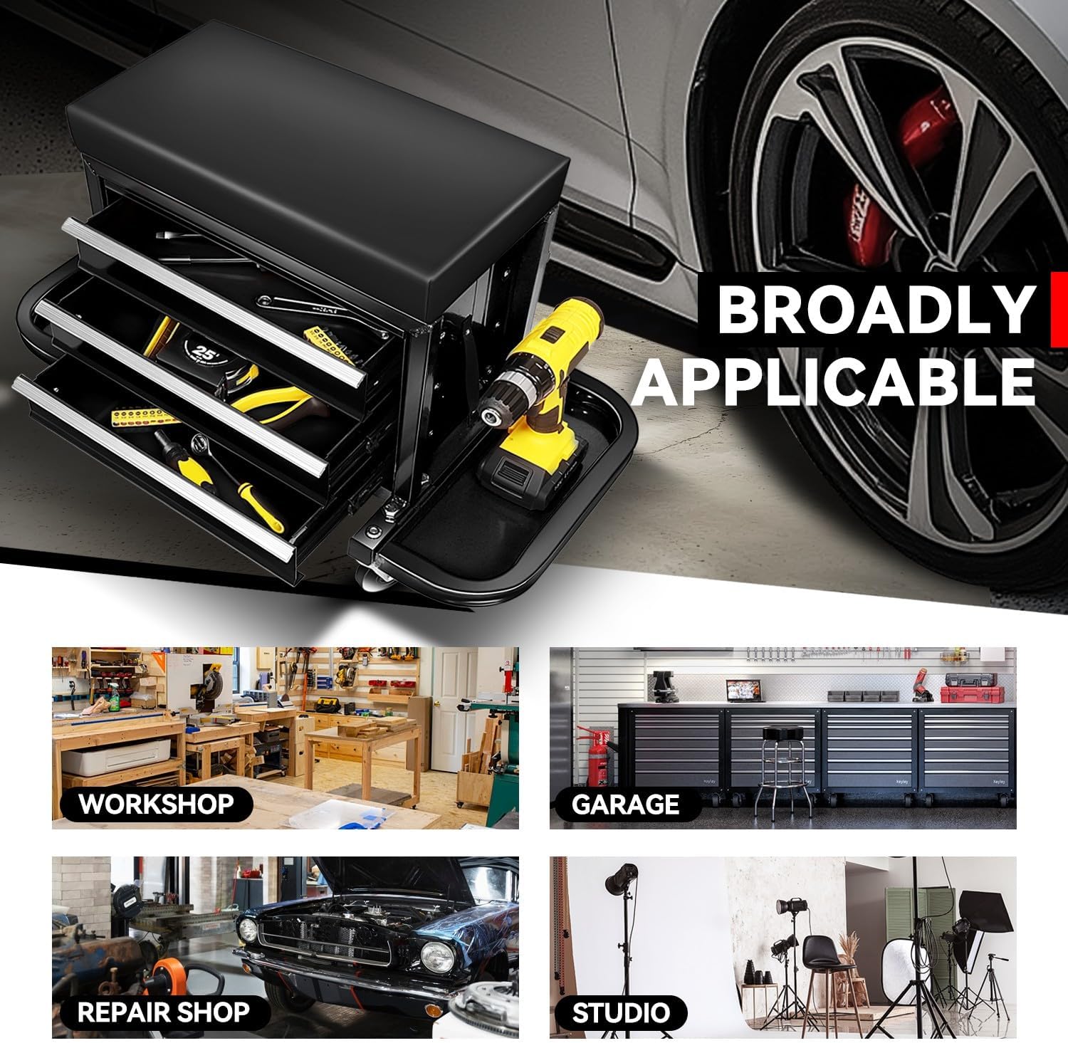 - Convenient Storage: This rolling seat has 3 drawers and 2 fold-down side trays, which offer ample storage for small tools and parts. Keep your car care and repair essentials close at hand, allowing you to work more efficiently.