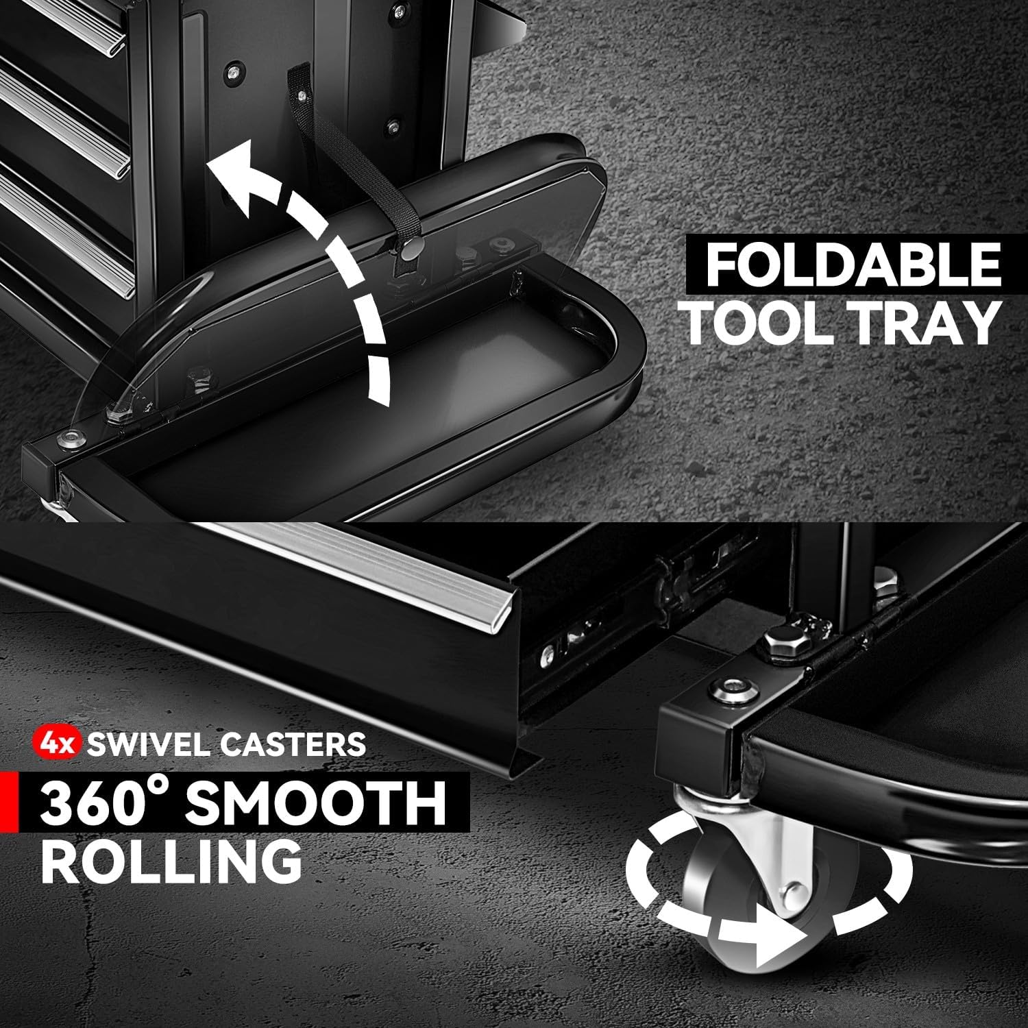 - Multifunctional: The rear tray securely holds screwdrivers and pliers, while the 3-drawer tool chest boasts smooth-rolling ball bearing slides. The 2 foldable side trays provide additional storage space when needed and fold away neatly when not in use.