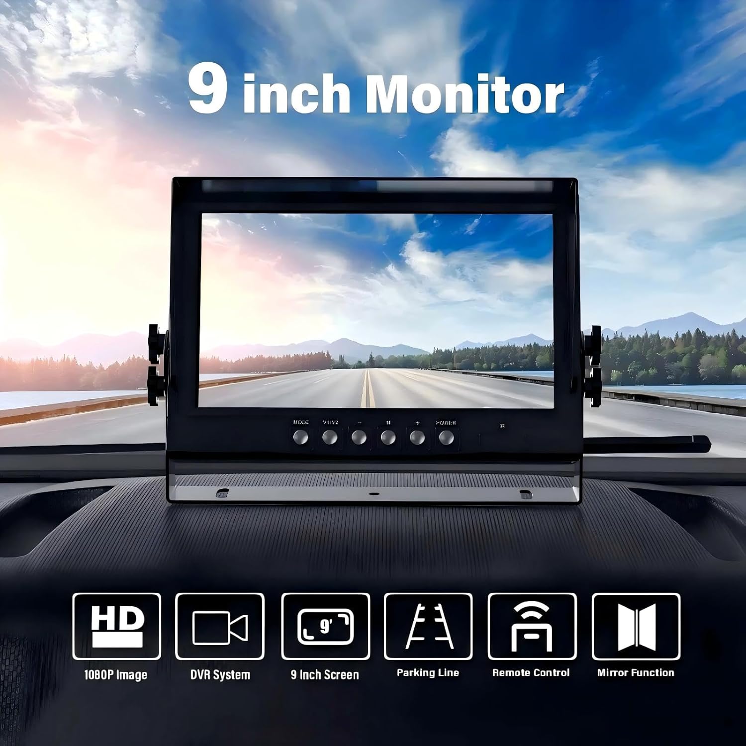 - The backup camera system is equipped with a 4-split 1080p monitor that enables a quad view display. It can display four video feeds simultaneously from the front, rear, and two side view cameras, providing a comprehensive view to eliminate blind spots. The system also includes a screen protection feature that turns off the display after 1, 2, or 5 minutes of inactivity.