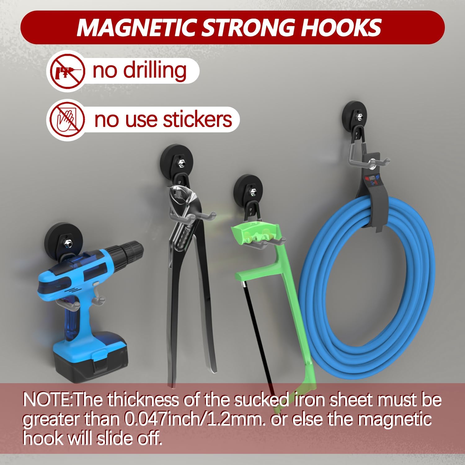 - Efficient Vertical Storage Solution: Discover the ultimate space-saving solution with our strong magnetic hooks. Versatile and reliable, these hooks are perfect for a multitude of environments, including garages, kitchens, offices, warehouses, gardens, and basements. These magnet hooks heavy duty help to reduce clutter and maximize available space, accommodating a variety of tools and equipment, including hoses, ropes, shovels, wires, cables, rakes, and more