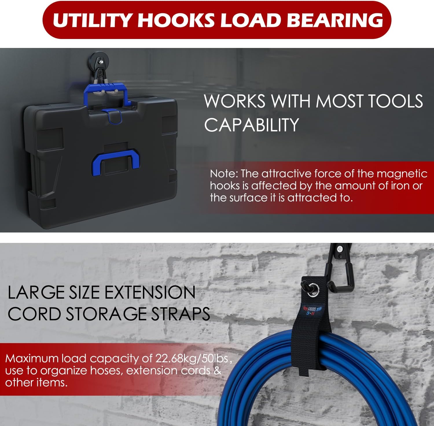 - Multi-functional Hook Magnets Heavy Duty: Your package includes 4 large U magnetic storage hooks, 2 extension cord organizer, and a comprehensive set of accessories comprising steel nails, flat washers, spring washers, and screws. For added convenience, the magnetic tool holder is accompanied by storage straps made of high-density nylon blend material with Velcro fastening, allowing for easy length adjustment and the hanging of various tools