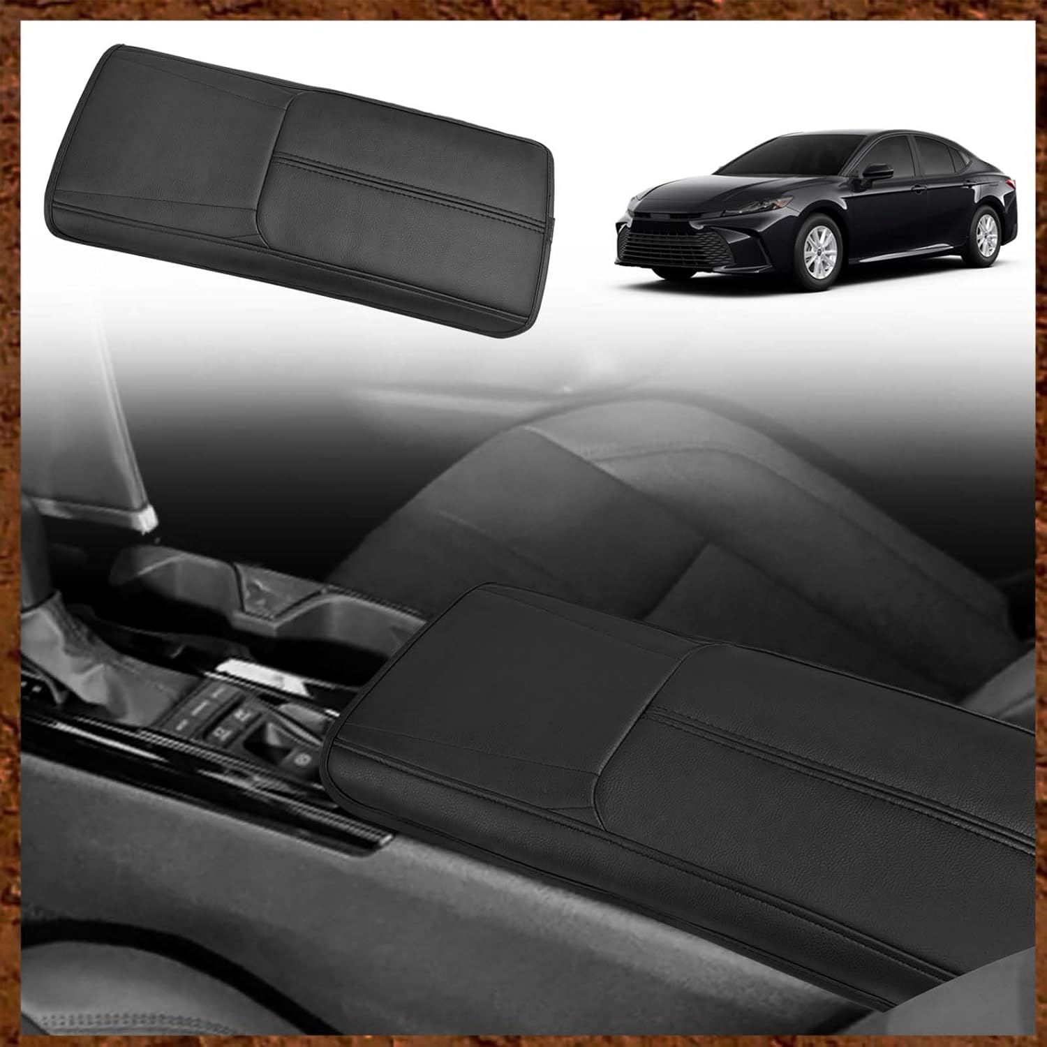 Muslogy Armrest Pad Center Console Cover Compatible with 2025 Toyota Camry LE SE XLE XSE Accessories Armrest Lid Protector Vegan Leather Extra Soft Lid Cushion (Black/Black Stitching)